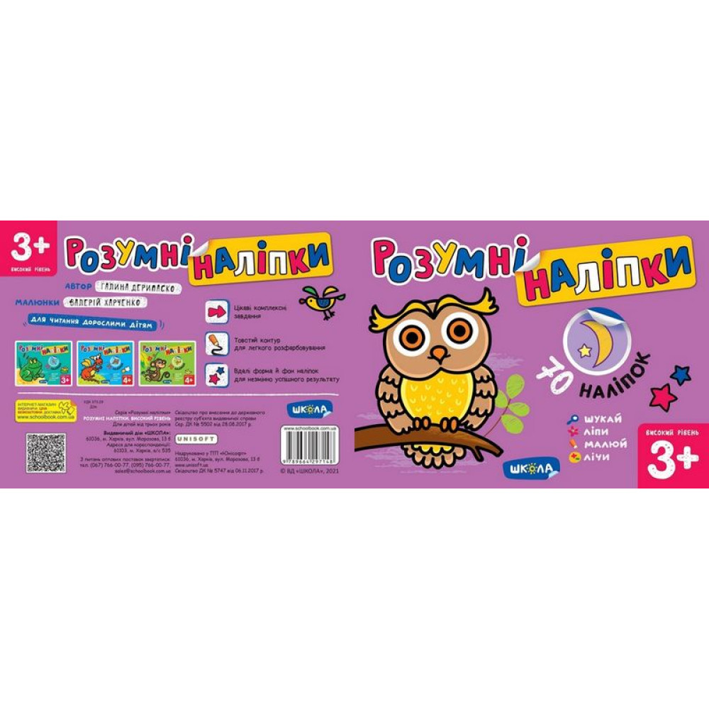 Книжки «Розумні наліпки» — найкращий варіант для розвитку дрібної моторики, логічного мислення, пам’яті, концентрації уваги, координації руху, зорового сприйняття дитини, а також для закріплення знань про навколишній світ і навичок лічби. У цих чудових альбомах зібрано велику кількість розвивальних наліпок і цікавих комплексних завдань. З яскравими, кольоровими наліпками захочуть гратися навіть непосидючі малюки. У завданнях використано ілюстрації для розфарбовування з товстим контуром, щоб робота малюка з олівцями була приємною і легкою. Фон і форму наліпок розроблено так, аби дитина мала завжди успішний результат.