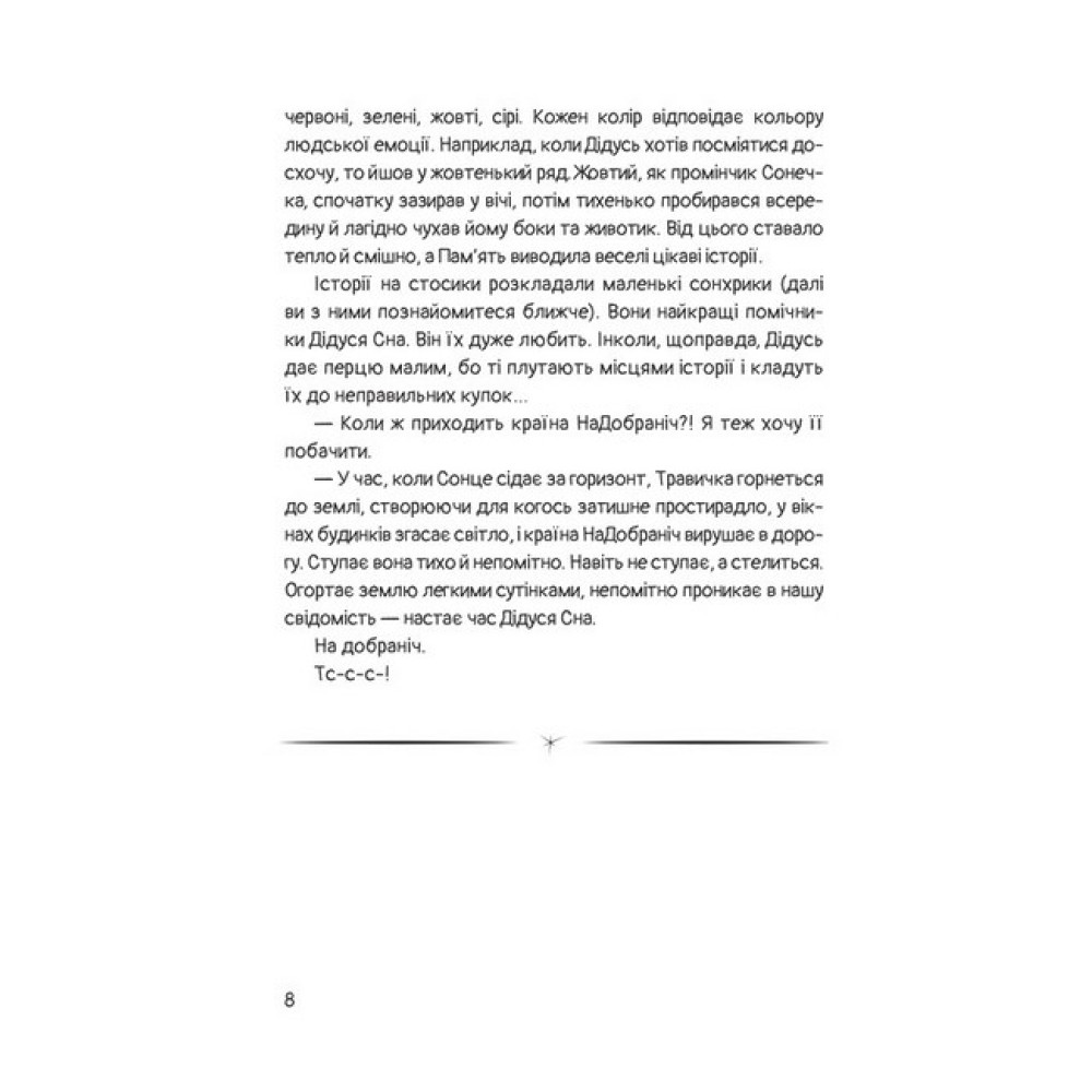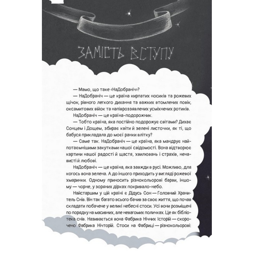 Кожен з нас – це дивовижний непізнаний світ. Світ таємниць і загадкових історій. Світ оксамитових бажань і цукрово-перчених мрій. У цьому світі все злагоджено і немає нічого зайвого. Трапляється, що певні механізми нашого світу виходять із ладу, і ми закриваємо себе на тисячі замків, ховаємо у мільйони потаємних скринь і боїмося туди зазирнути. На щастя, є Країна НаДобраніч, в якій живе великий мрійник Чимчикун, герой цієї книги, він знає, як відімкнути замки, зняти важкі засуви і відкрити скрині людського світу. Вирушайте в подорож з Чимчикуном, але стережіться, поряд чатує страшний чародійник Морок.
