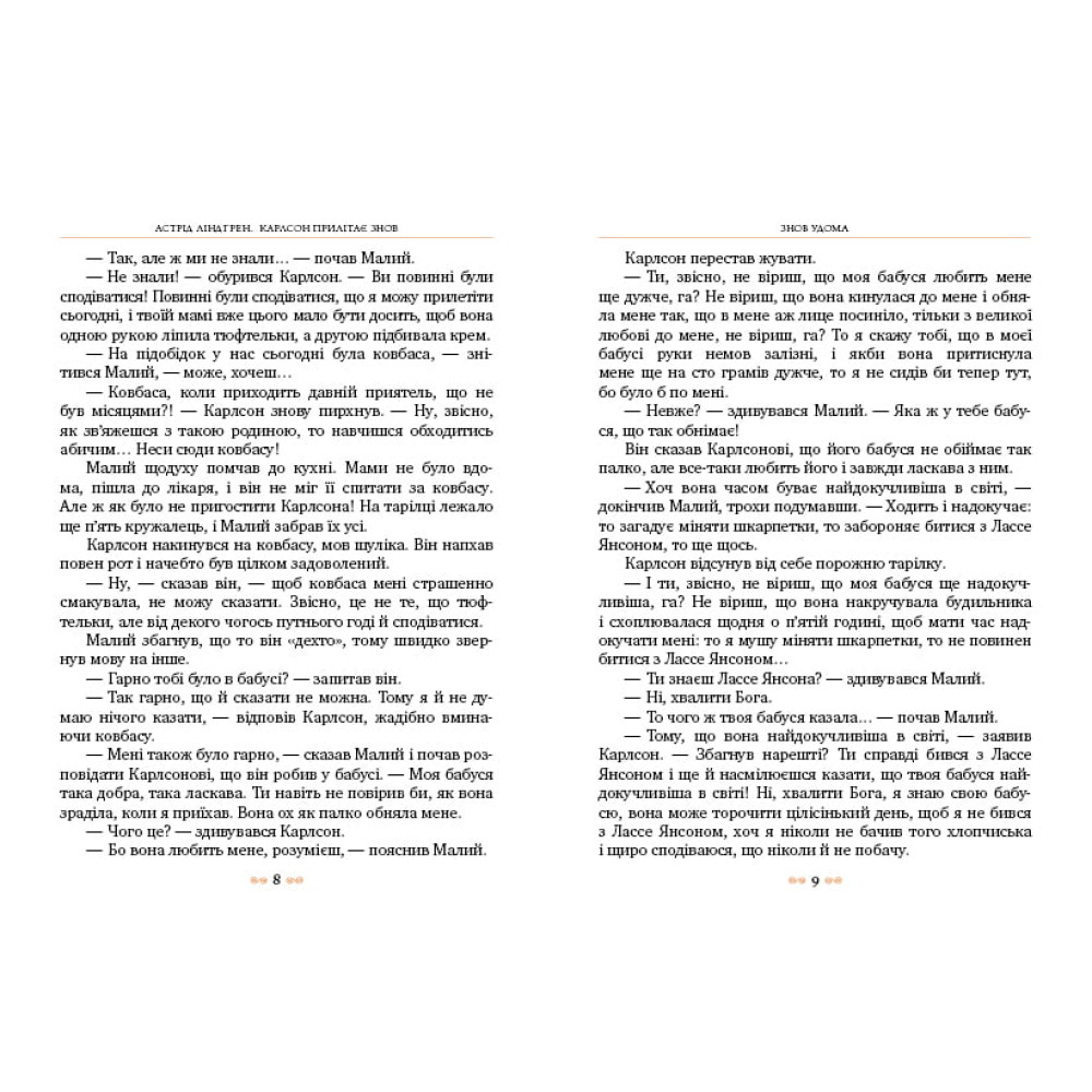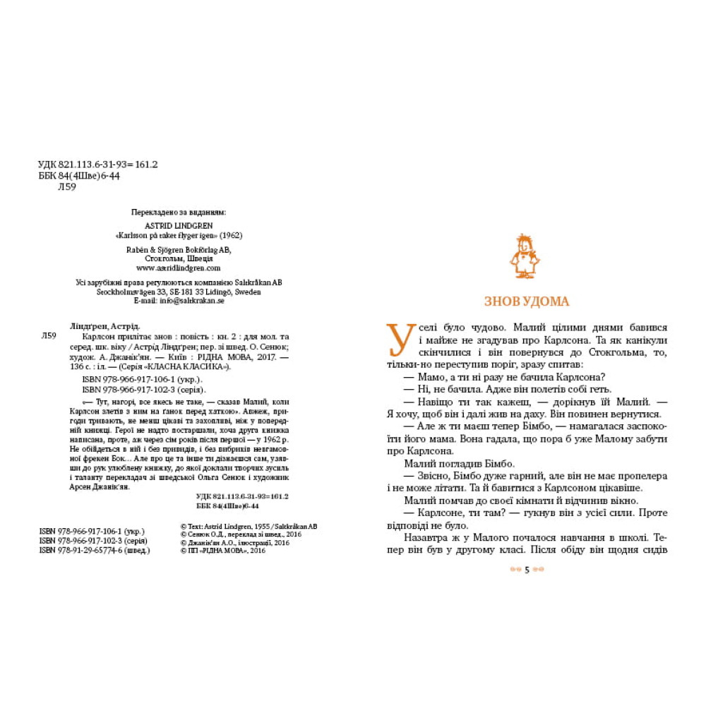 «— Тут, нагорі, все якесь не таке, — сказав Малий, коли Карлсон злетів з ним на ґанок перед хаткою». Авжеж, пригоди тривають, не менш цікаві та захопливі, ніж у попередній книжці. Герої не надто постаршали, хоча друга книжка написана, проте, аж через сім років після першої — у 1962 р. Не обійдеться в ній і без привидів, і без вибриків невгамовної фрекен Бок... Але про це та інше ти дізнаєшся сам, узявши до рук улюблену книжку, до якої доклали творчих зусиль і таланту перекладачка зі шведської Ольга Сенюк і художник Арсен Джанік’ян.Карлсон прилітає знов (кн.2)