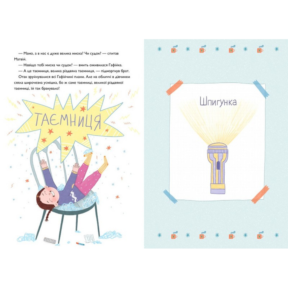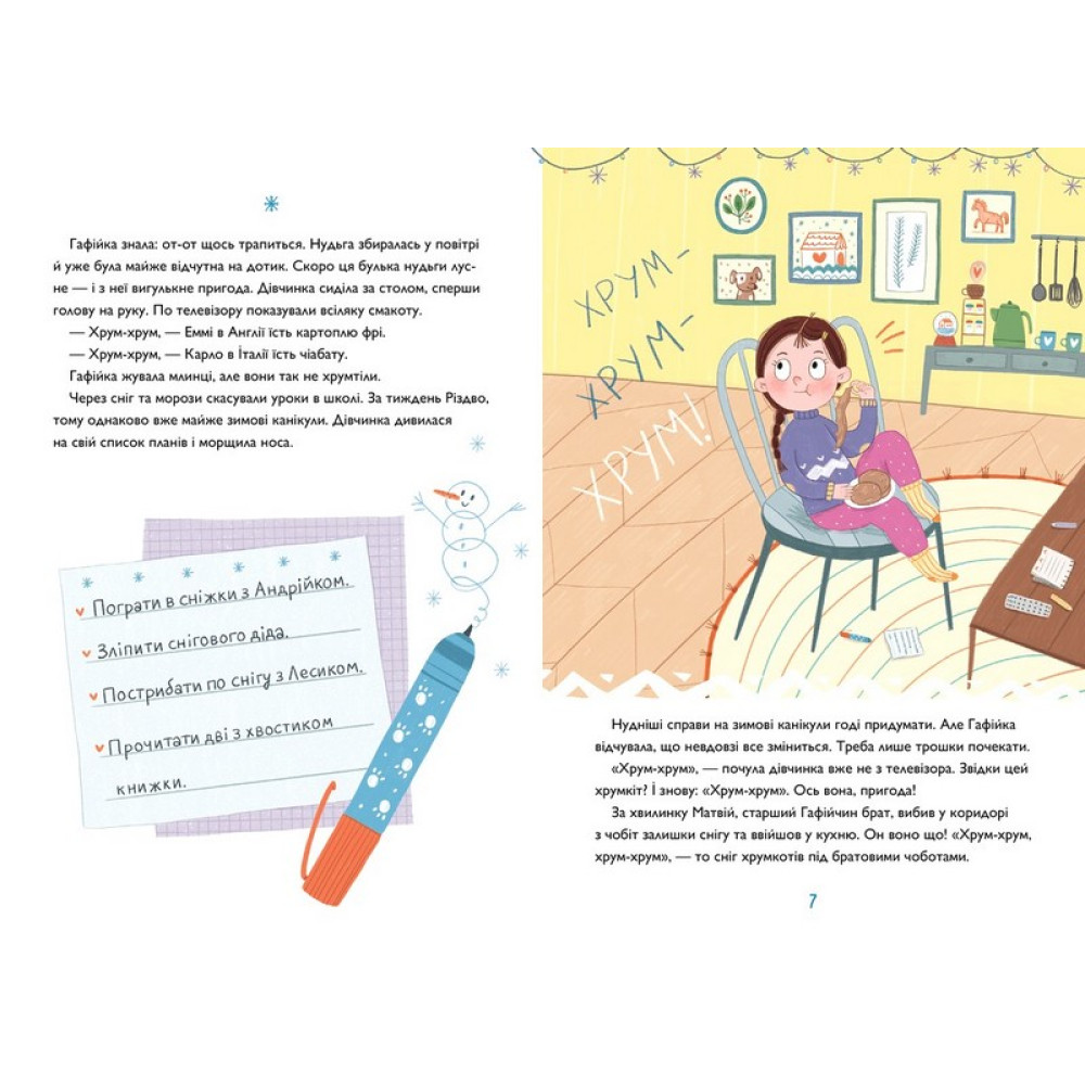 Зимові канікули — час пригод і таємниць! Хрум-хрум, хрум-хрум… Цей загадковий звук запрошує Гафійку до несподіваного детективного розслідування. Разом із другом дівчинка намагається з’ясувати, що приховує її брат Матвій у дворі. Знайдені підказки ще більше заплутують, але Гафійка вперто шукає відповіді. Чи вдасться їй розгадати велику таємницю до Різдва? Чому варто придбати: • затишна різдвяна історія від української авторки • захоплива детективна лінія• добрий гумор і кумедні деталі на ілюстраціях • покрокова інструкція, як побудувати іглу.