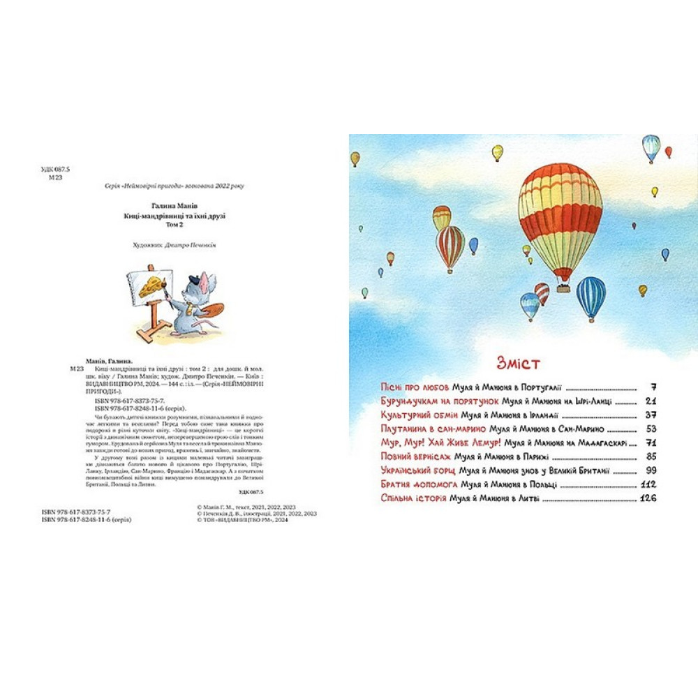 Чи бувають дитячі книжки розумними, пізнавальними й водночас легкими та веселими? Перед тобою саме така книжка про подорожі в різні куточки світу. «Киці-мандрівниці» — це короткі історії з динамічним сюжетом, неперевершеною грою слів і тонким гумором. Ерудована й серйозна Муля та весела й трохи наївна Манюня завжди готові до нових пригод, вражень і, звичайно, знайомств.У другому томі разом із кицями маленькі читачі завиграшки дізнаються багато нового й цікавого про Португалію, Шрі-Ланку, Ірландію, Сан-Марино, Францію і Мадагаскар. А з початком повномасштабної війни киці вимушено помандрували до Великої Британії, Польщі та Литви.