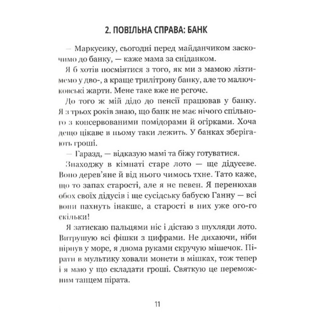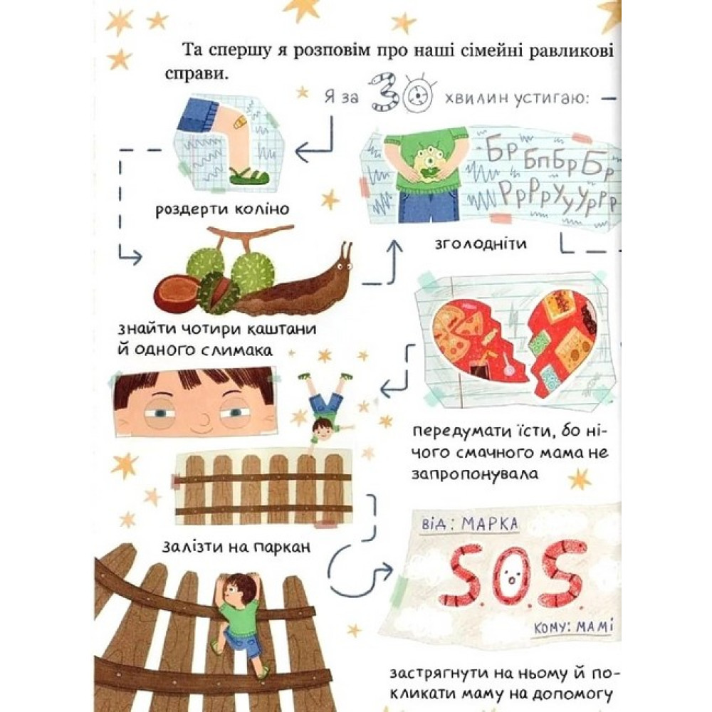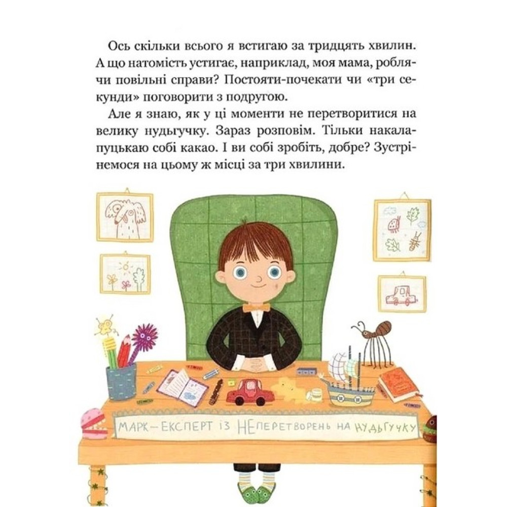 Шестирічний Марко знає, як зробити цікавою будь-яку справу. Своєю безмежною фантазією він перетворює нудні збирання в садок на підготовку до подорожі в космос, підслуховує розмови гілок на дереві й навіть бере участь у кулінарному шоу, уявляючи, як смакує книжкова шафа. А тоді святкує все переможними танцями пірата, саламандри чи каменя.Збірка кумедних і надихаючих оповідань сприятиме розвитку вигадливості та креативності дошкільнят. Вона навчить їх пізнавати світ, застосовуючи свою фантазію.