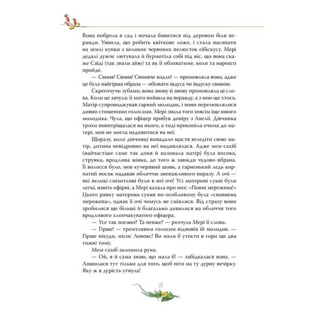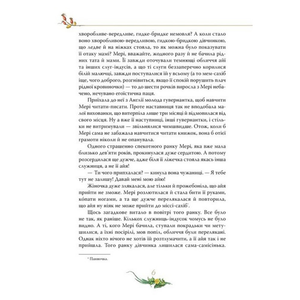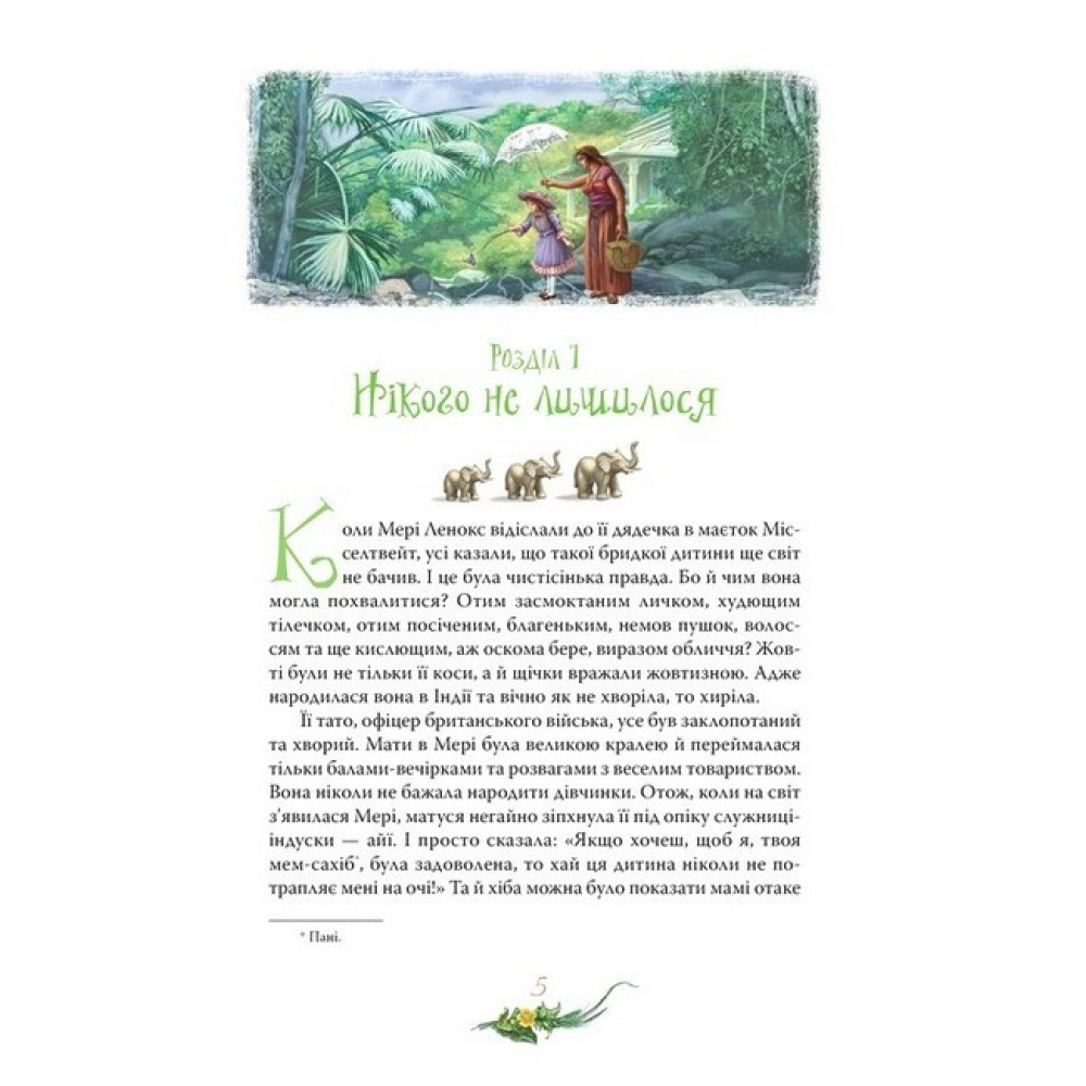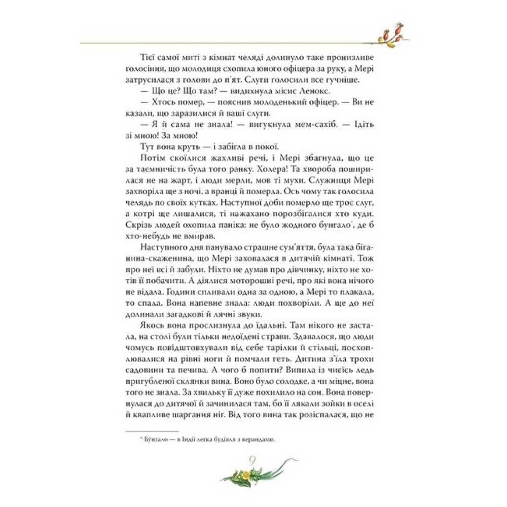У безберегому книжковому морі не так уже й багато знайдеться життєствердних книжок, які однаковою мірою цікаві й дорослим, і дітям. Такою перлиною світової літератури, заради якої варто поринути в бездонні глибини письменницької фантазії, є книжка знаменитої англійської авторки Френсіс Бернетт «Таємний сад» (1911).Головна героїня роману, Мері Ленокс, переїхавши з далекої екзотичної Індії до Туманного Альбіону, опинилася в незвичній для себе ролі: їй треба навчитися не тільки наказувати, а й просити. Вона шукає приховані двері до таємного саду. Здається, вже із цього моменту розпочинаються справжні чари… Та ні, вони почалися ще з першої сторінки, коли егоїстична дівчинка поступово перероджується, відкриває в собі здатність розуміти й любити інших людей, а разом із нею змінюється й увесь навколишній світ…