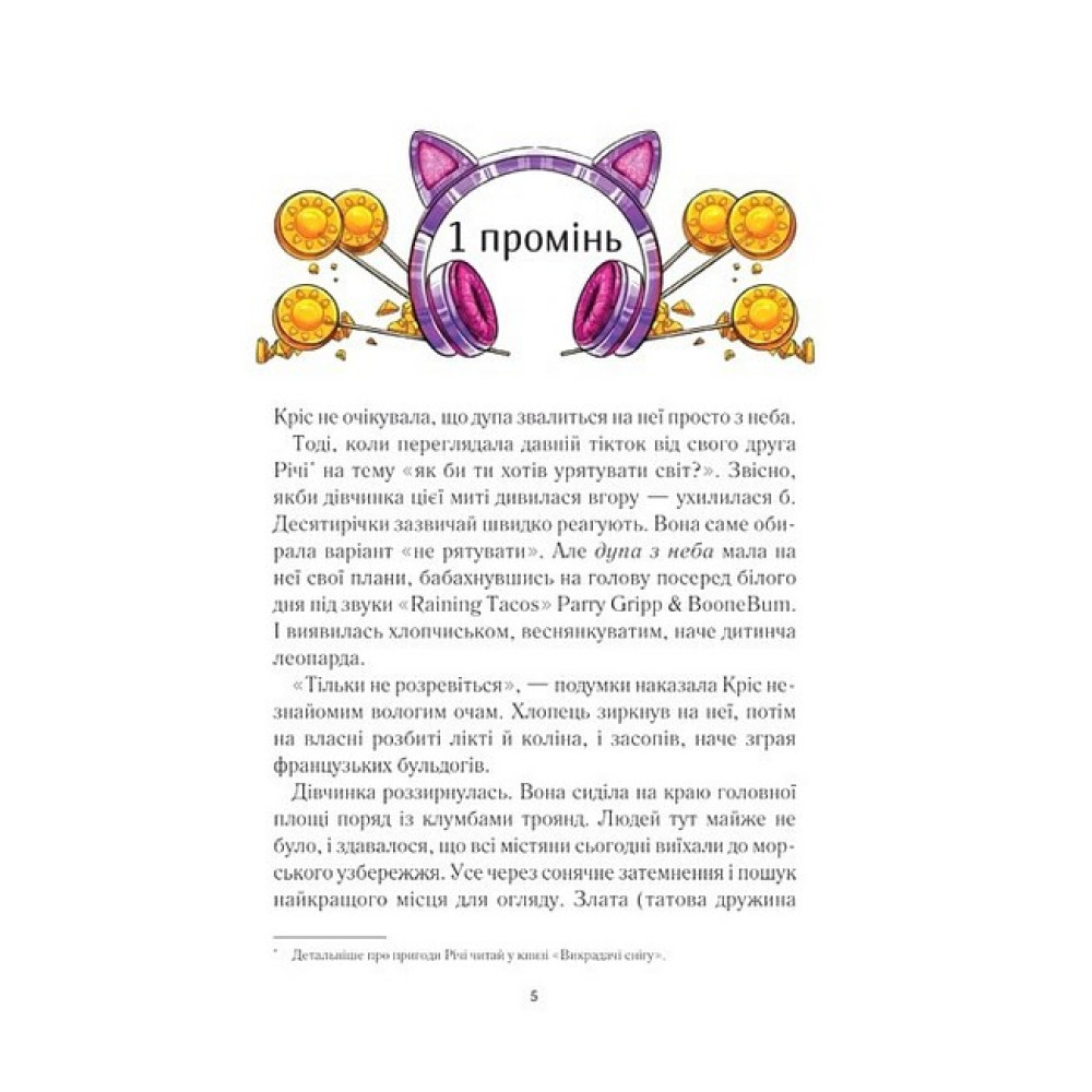 Десятирічна Кріс — затята читачка, яка знає все про потраплянців. Проте коли їй на голову в прямому сенсі звалюється дивакуватий хлопець з драконячим яйцем у руках, стверджуючи, що він із Сонця і за ним полюють — це явно щось поза межами книжок. Хай би як Кріс намагалась уникнути загадкових пригод, із яйця вилуплюється дракон і не відходить від неї ні на крок. А одночасно з цим згасає Сонце, і тепер усе людство ризикує перетворитися на крижинки без його тепла. Часу обмаль. Чи зможе Кріс довіритися незнайомцю і повернути дракона додому, щоб урятувати не лише Землю, а й Сонце?