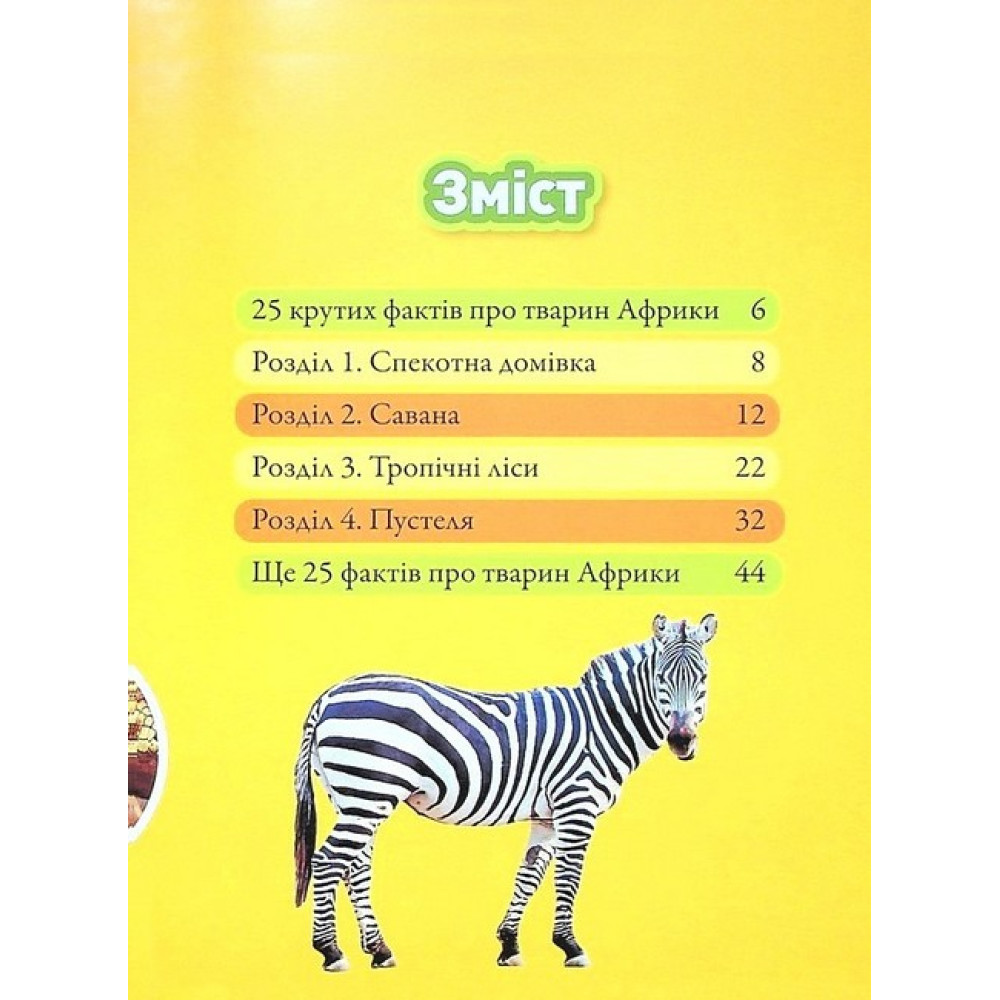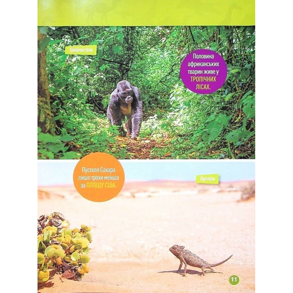 Ця яскрава дитяча енциклопедія – справжня подорож у світ дикої природи Африки! Книга познайомить маленьких читачів з найдивовижнішими мешканцями цього континенту – від грізних хижаків до милих травоїдних. На її сторінках можна дізнатися 100 цікавих фактів про поведінку, звички та унікальні особливості тварин Африки. Чому леви називаються «королями савани»? Які таємничі звірі ховаються у тропічних лісах Які тварини здатні виживати в найсуворіших умовах пустелі? Діти поринуть у захоплюючий світ природи з яскравими та пізнавальними ілюстраціями. Книга стане ідеальним подарунком для юних натуралістів і тих, хто мріє дізнатися більше про тваринний світ нашої планети.