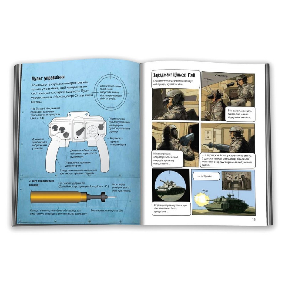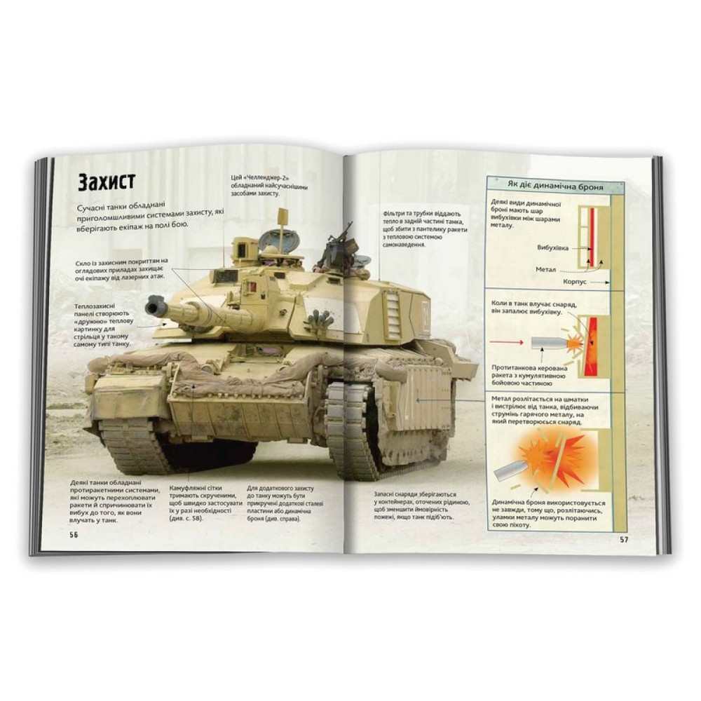 Що таке танк? Що робить екіпаж танка? Як танки долають важкопрохідну місцевість? Як виглядатимуть танки майбутнього?. З цією книжкою ви потрапите всередину найкращих танків у світі, від металевих монстрів Першої світової війни, до сучасних високотехнологічних роботів. Прочитайте про справжні танкові бої та дізнайтеся, як удосконалювалося озброєння та захист екіпажу для перетворення танка на смертельну бойову машину. У цій книжці багато захопливої інформації, цікаві фотографії та рисунки. ст. 4 - Що таке танки? ст. 6 - Вогнева міць ст. 8 - Гусениці ст. 10 - "Челленджер-2" ст. 12 - Покатаємось ст. 14 - Вид назовні ст. 16 - Взяти на мушку ст. 20 - Двигун ст. 22 - Перший танк ст. 26 - Танки перемагають ст. 28 - Конфлікт гігантів ст. 30 - Друга світова війна ст. 32 - Панцери-вбивці ст. 34 - Король доріг ст. 38 - Переможна робоча конячка ст. 42 - Протитанкова зброя ст. 46 - Холодна війна ст. 52 -Танки сьогодні ст. 54 - На полі бою ст. 56 - Захист ст. 60 - Маскування ст. 64 - Нічний бій ст. 66 - Зменшення розмірів ст. 70 - Перерозподіл навантаження ст. 72 - Які були перші танки ст. 74 - Танки в інтернеті ст. 76 - Список спеціальних термінів ст. 78 - Алфавітний покажчик ст. 80 - Подяки