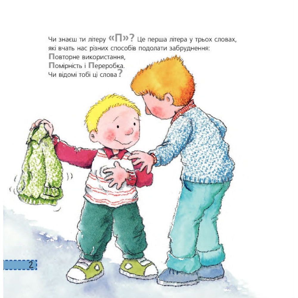Повторне використання, помірність, переробка — три важливі означення на літеру «П», які навчають, що ми можемо зробити, аби зменшити забруднення довкілля. Коли ми помірно використовуємо речі, то допомагаємо зберігати землю, на якій живемо, чистою, а воду, яку п'ємо, — свіжою. Повторно використовувати - це також чудова ідея. Знайдіть нове застосування речам, які уже хотіли викинути. Ми можемо переробляти папір, консервні банки, скляні пляшки тощо. Помістіть це у спеціальні контейнери, звідти їх заберуть і перероблять на нові та корисні речі. Три «П» — хороший спосіб зробити нашу планету чудовим місцем для життя. А книга підкаже, як це здійснити.