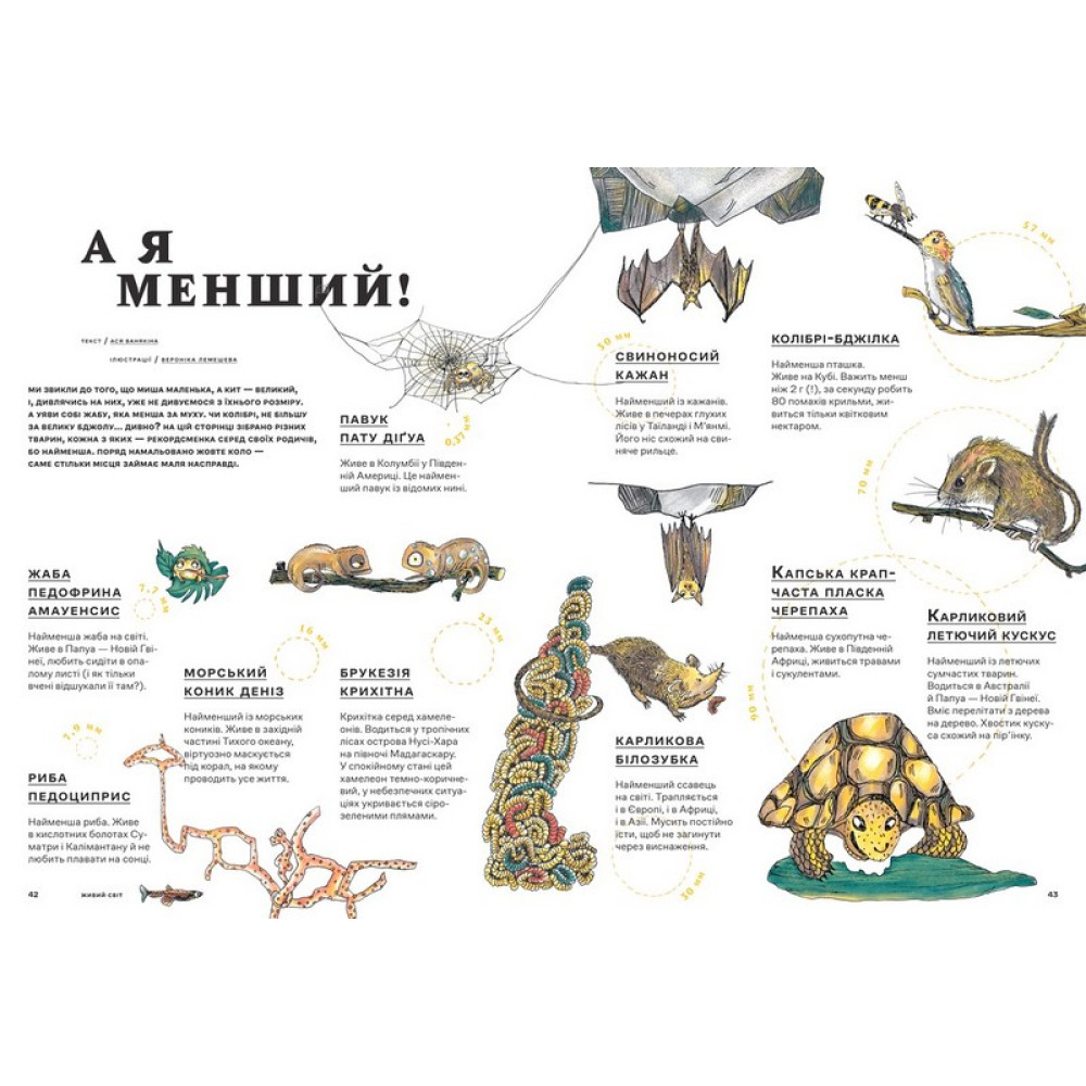 Це збірка оповідань, віршів, завдань і дивовижних фактів про все маленьке і непомітне, до того ж із чудовими ілюстраціями. Ми поговоримо з дітьми про атоми і пікселі, мікроскопи й бактерії, пуантилістів і мініатюри в кіно, про крихітних тварин і Великий адронний колайдер. Легко і доступно. Ми розповідаємо про складне просто, щоб було зрозуміло молодшому школяреві. Показуємо світ зусібіч. В альманасі зібрані цікаві відомості з найрізноманітніших сфер — фізика й мистецтво, біологія і лінгвістика, математика та історія, — як у кращих освітніх програмах. Буде цікаво.На кожному розвороті — сюрприз! Ми зібрали тексти різних жанрів, тем і форматів, аби будь-який читач знайшов для себе щось цікаве. Не на один раз. В альманасі 26 статей — задоволення можна розтягнути надовго.