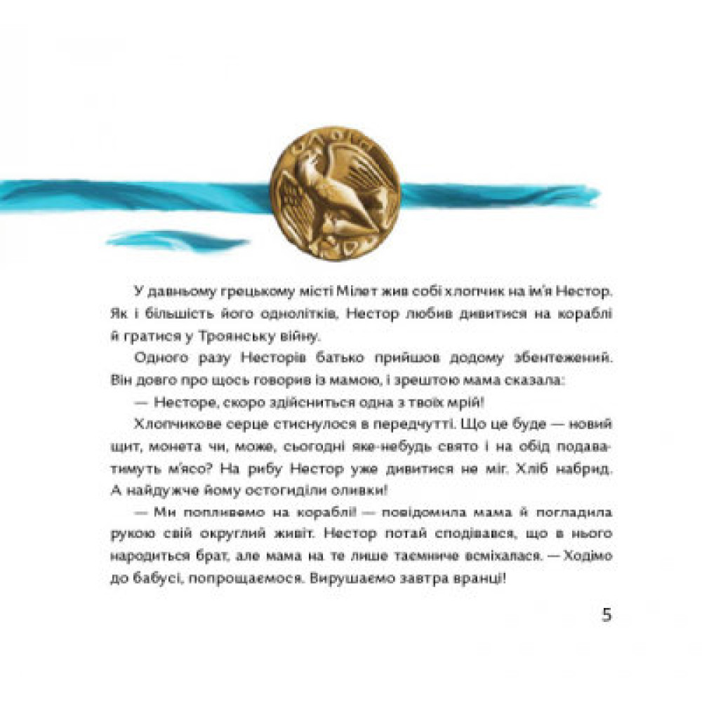 Сімя давніх греків у пошуках кращого життя вирушає в далекі причорноморські землі, де вже є кілька грецьких поселень. Тут антична культура сплітається з місцевою, степовою. Як це — довго-довго мандрувати по морю в невідомість? Яку часточку рідного дому можливо привезти з собою, а що залишиться тільки щемким спогадом? Нестор з сім’єю вирушає на кораблі з грецького міста Мілет до Тіри, де буде їхня нова домівка. В Мілеті залишилася його бабуся, яка подарувала йому в дорогу мішечок з оливками. Ніщо не радувало героя, хотілося повернутися додому та ще й капосне море забрало його улюблену іграшку — дерев’яного коника. Та врешті корабель причалив до берега міста, що має стати новим домом для мандрівників. Нестор знайде тут друзів, а оливковий сад, посаджений переселенцями, нагадуватиме йому про стареньку бабусю й полишене попереднє житло. Унікальність видання – це складові, що допомагають дорослим знайти правильні слова для обговорення психологічних моментів з дітьми та глибшого розуміння історичного контексту: детальний бекґраунд за QR-кодом ігрова закладка.