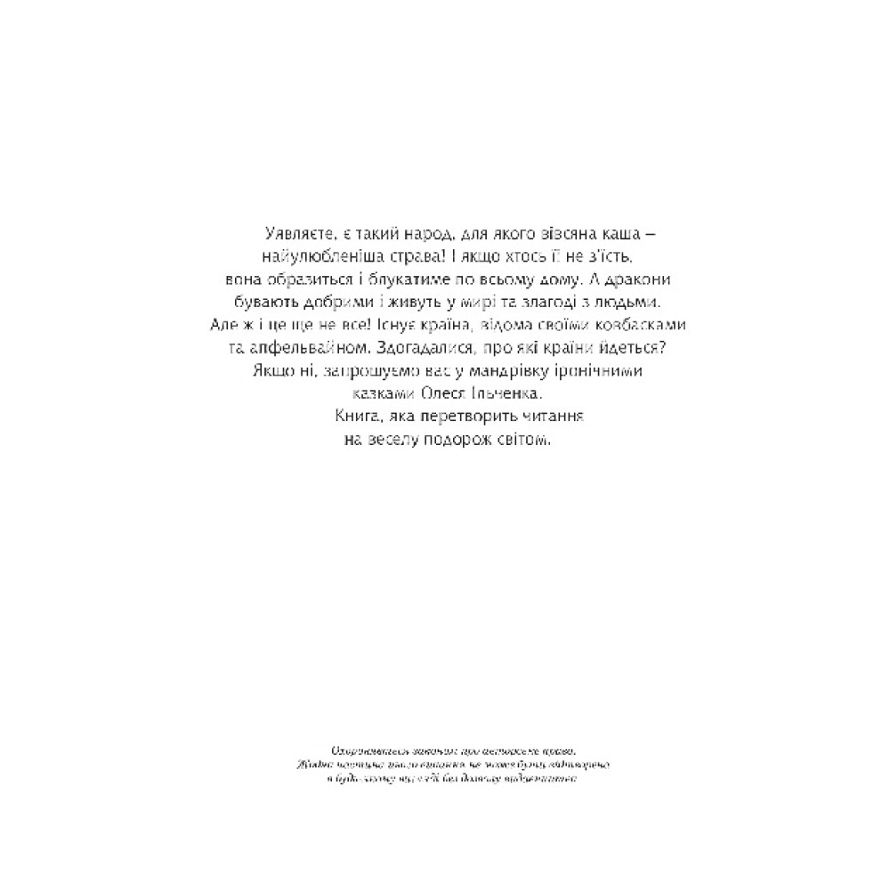 Уявляєте, є такий народ, для якого вівсяна каша – найулюбленіша страва! І якщо хтось її не з’їсть, вона образиться і блукатиме по всьому дому. А дракони бувають добрими і живуть у мирі та злагоді з людьми. Але ж і це ще не все! Існує країна, відома своїми ковбасками та апфельвайном. Здогадалися, про які країни йдеться? Якщо ні, запрошуємо вас у мандрівку іронічними казками Олеся Ільченка. Книга, яка перетворить читання на веселу подорож світом.