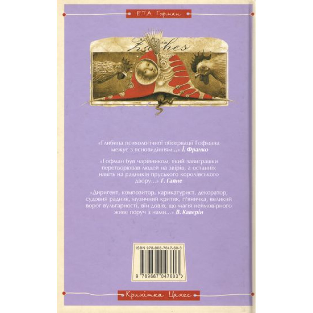 Видання містить три знамениті танцювальні повісті Гофмана: «Крихітка Цахес», «Золотий горщик», «Лускунчик».Ці казки сповнені іронічного гротеску, властивого епосі романтизму. Вони розповідають не тільки про світ земний, звичайний, але й занурюють читача в інший світ, повний чудес і тривог.Ернст Теодор Амадей Гофман - німецький письменник, композитор, художник.Чудові ілюстрації відомого українського художника Владислава Єрка неодмінно сподобаються вашій дитині.Крихітка Цахес