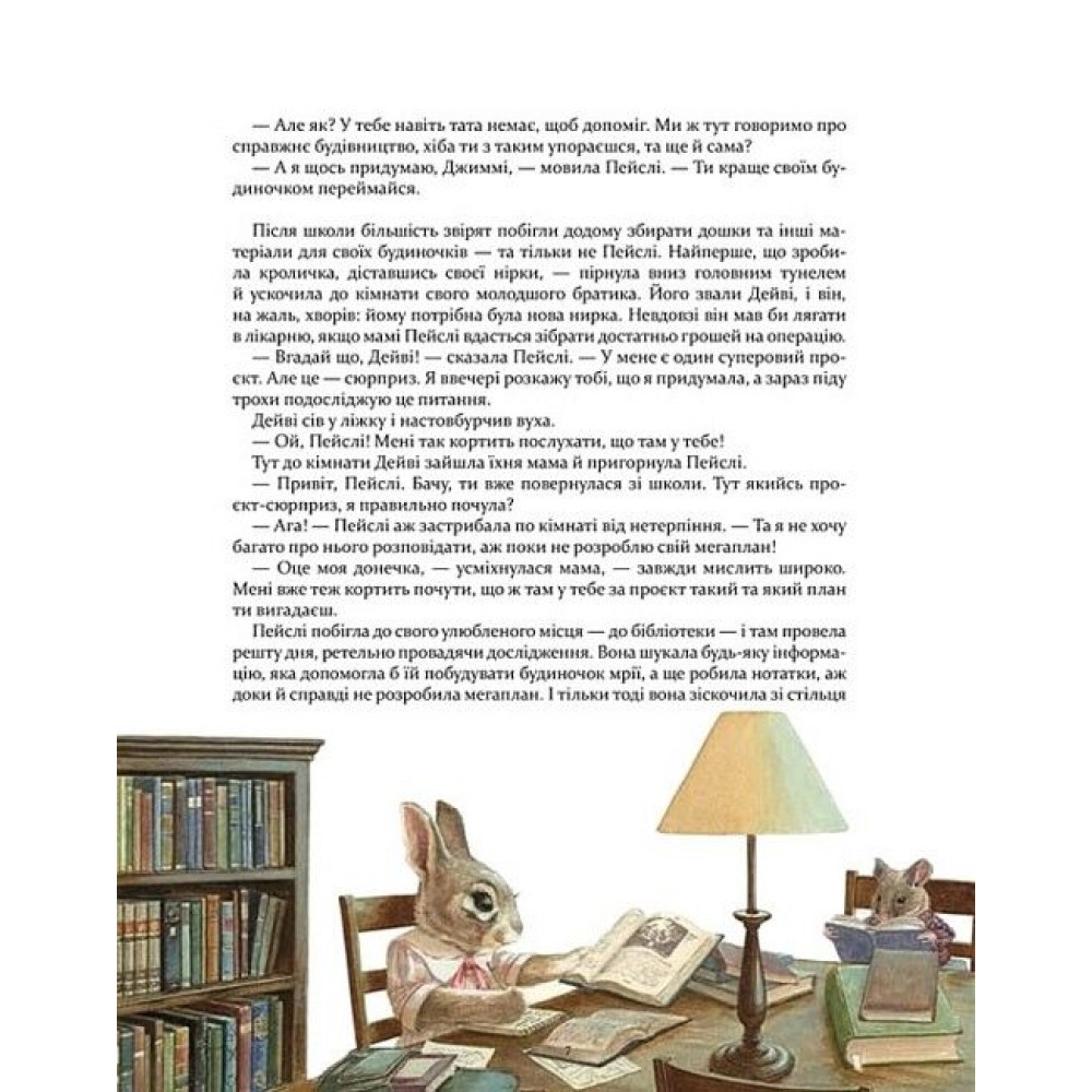 Літні канікули закінчилися, усі звірята повернулися до лісової школи. На першій же перерві дехто забагато вихвалявся, і тепер між однокласниками починається справжнє змагання — конкурс будиночків на дереві. Пейслі жодного разу не тримала в лапках молотка й цвяхів, проте теж долучається до конкурсу. Чому ж маленька кроличка не зважає на кпини і сподівається перемогти? Ця книжка торкається багатьох тем: розважливість і самовпевненість, суперництво й уміння гідно програвати, ставлення однолітків до дитини з неповної сім’ї, творчий підхід до розв’язання проблем, допомога тим, хто потребує підтримки... Історія Пейслі покаже, як важливо знайти гідну мету й сміливо чеберяти лапками до неї. Такий шлях допоможе повірити в себе, згуртувати однодумців, і тоді всі перешкоди — кроленяті по коліна!