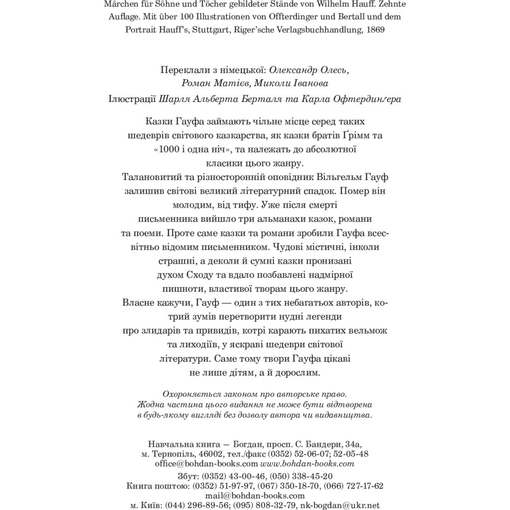 Казки Гауфа займають чільне місце серед таких шедеврів світового казкарства, як казки братів Ґрімм та «1000 і одна ніч», та належать до абсолютної класики цього жанру. Талановитий та різносторонній оповідник Вільгельм Гауф залишив світові великий літературний спадок. Помер він молодим, від тифу. Уже після смерті письменника вийшло три альманахи казок, романи та поеми. Проте саме казки та романи зробили Гауфа всесвітньо відомим письменником. Чудові містичні, інколи страшні, а деколи й сумні казки пронизані духом Сходу та вдало позбавлені надмірної пишноти, властивої творам цього жанру. Власне кажучи, Гауф — один з тих небагатьох авторів, котрий зумів перетворити нудні легенди про злидарів та привидів, котрі карають пихатих вельмож та лиходіїв, у яскраві шедеври світової літератури. Саме тому твори Гауфа цікаві не лише дітям, а й дорослим.