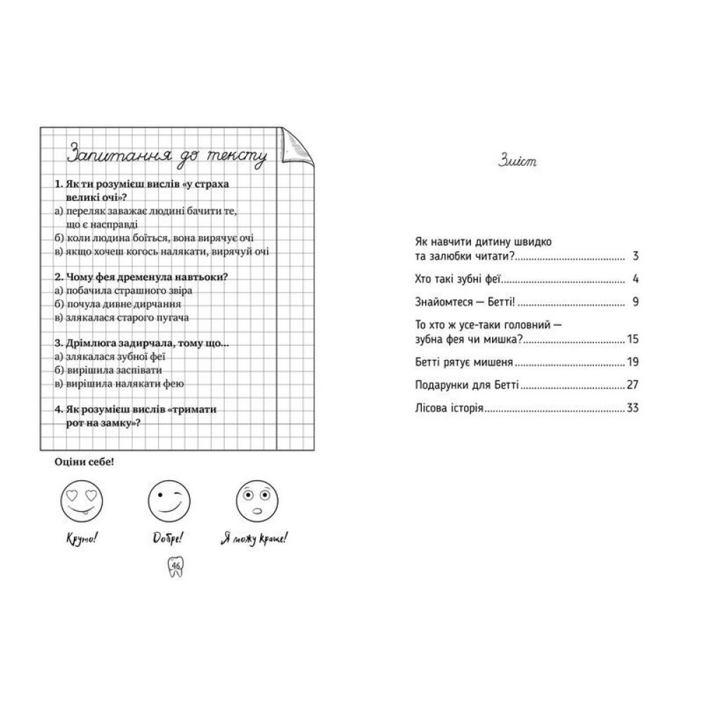 «Ти маєш навчитися швидко читати!» — як набридло тобі чути це від старших братів і сестер, батьків і вчителів, що читають так, ніби розказують напам’ять. Хочеться відповісти їм: «Якби ж то читати було так легко і весело, як грати на планшеті. Дивіться, як швидко я перемагаю у грі!» А що ти скажеш, якщо, прочитавши лише кілька сторінок «Оповідок зубної феї», ти вже значно покращиш техніку читання?! У цій книжці літери великі, а рядки короткі; тексту мало, зате повно малюнків, які можна розфарбовувати! Хіба не ідеальна книжка для тебе?«Оповідки зубної феї» — це короткі, але дуже цікаві історії від найталановитішої в світі чарівниці! Наприкінці кожної історії — запитання, відповівши на які, ти отримаєш від мами (чи того, хто вчить тебе читати) заслужене #оце–молодець! Числа наприкінці рядочків — це кількість прочитаних тобою слів. Тож дорослі можуть швидко порахувати, скільки слів ти читаєш за хвилину. Кілька спроб — і он як ти вже тарабаниш! І зауваж — ніякої магії! Ну хіба зовсім трішки, адже оповідачка — справжня фея!..