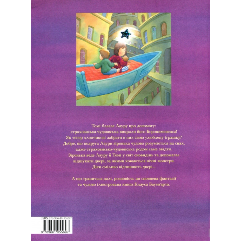 Томі благає Лауру про допомогу: страховиська-чудовиська викрали його Боронименепса! Як тепер хлопчикові забрати в них свою улюблену іграшку? Добре, що подруга Лаури зіронька чудово розуміється на снах, адже страховиська-чудовиська родом саме звідти. Зіронька веде Лауру й Томі у світ сновидінь та допомагає відшукати двері, за якими ховаються нічні монстри. Діти сміливо відчиняють двері... А що трапиться далі, розповість ця сповнена фантазії та чудово ілюстрована книга Клауса Баумґарта.