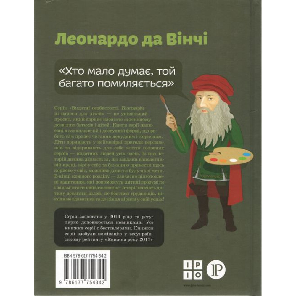 Книга «Леонардо да Вінчі» з серії «Видатні особистості. Біографічні нариси для дітей» розкриє всі таємниці і секрети одного з найгеніальніших художників і вчених.Не дивлячись на те, що професія художника в 15 столітті була не популярною, Леонардо залишався вірним своєму таланту і це допомогло йому досягти всесвітнього успіху. Талантів у Леонардо да Вінчі було чимало, але також Леонардо володів надзвичайною працьовитістю, терпінням і позитивним поглядом на життя. Адже його допитливість і інтерес до всього навколишнього світу привели до багатьох відкриттів, а також дали прогрес науці на багато століть вперед. Не дивлячись на багато труднощів у житті, відданість своїй роботі була понад усе, а також допомагала рухатись тільки вперед.