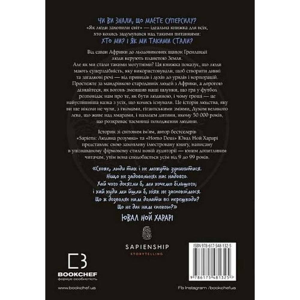 Ювал Ной Харарі, автор світових бестcелерів «Sapiens: Людина розумна» та «Homo Deus», знову повертається до питання, яке все ще турбує людство: як з’явилися люди і чому саме людина, а не лев чи, наприклад, ведмідь, стала володарем світу? Здається, у автора є розгадка.Це перша книга, яку всесвітньовідомий історик адресує дітям, хоча, звісно, вона буде цікава й дорослому читачеві. В цікавій розповідній формі, з логічним викладом, характерним для всіх його книг, у хронологічному порядку автор пояснює етапи розвитку історії світу від первісних часів. Читачі разом з автором, неначе детективи, дослідять печери та артефакти, що збереглися донині, та спробують розгадати історичні загадки.Ця книга — чудова альтернатива шкільним підручникам, і її можна читати разом із дітьми. Пропонуємо юному читачеві поринути у стародавній світ через образи, відтворені в яскравих ілюстраціях талановитого художника Рікарда Заплани Руїса, та перенестися в ті часі, де панування людини ще не було таким очевидним і де зв’язок із природою був вирішальним. Це перша книга із чотиритомної серії видань «Нестримні ми».