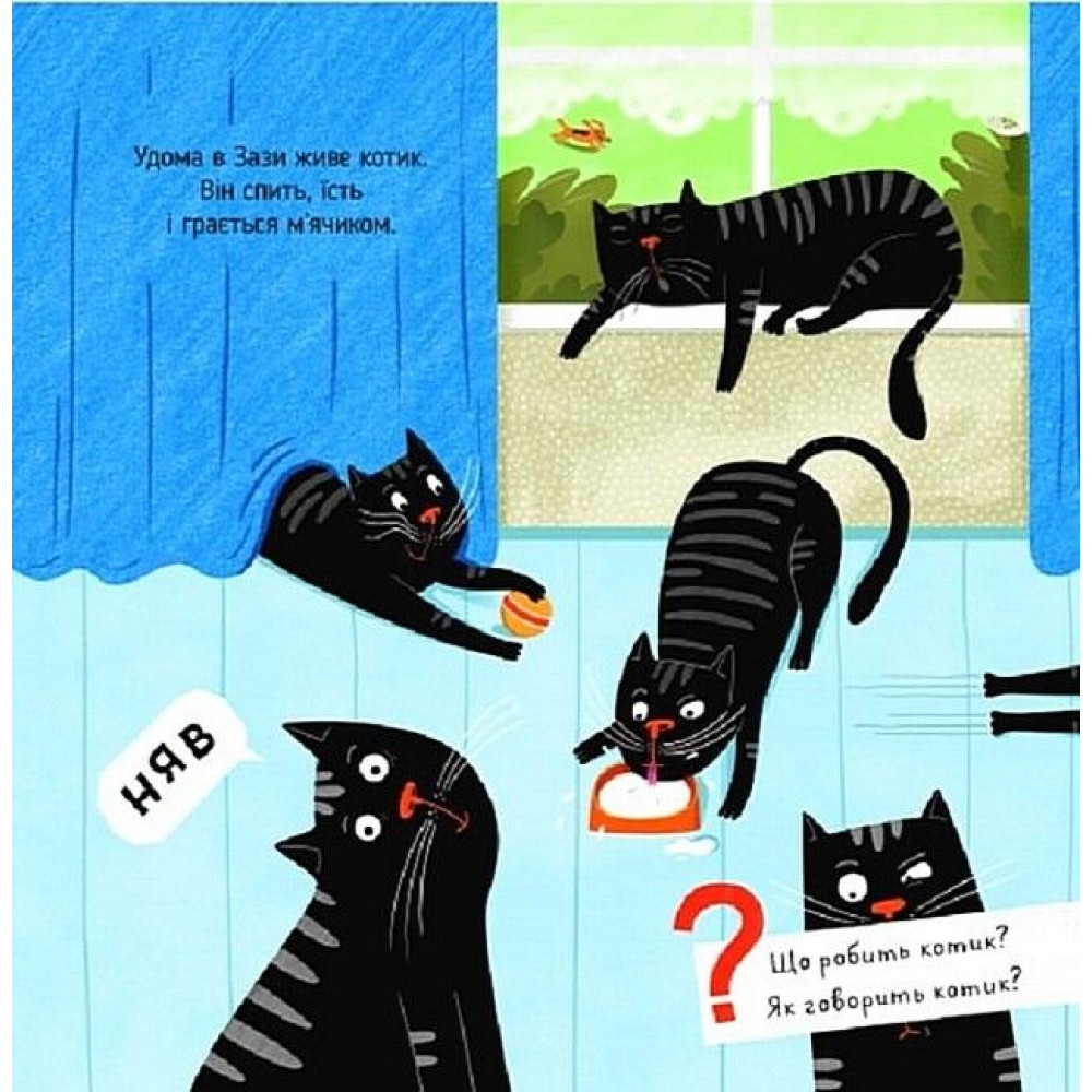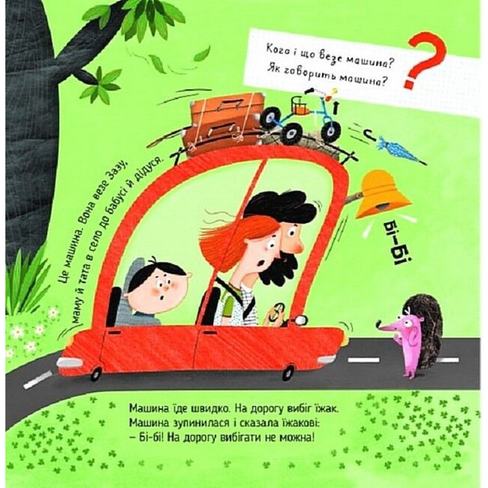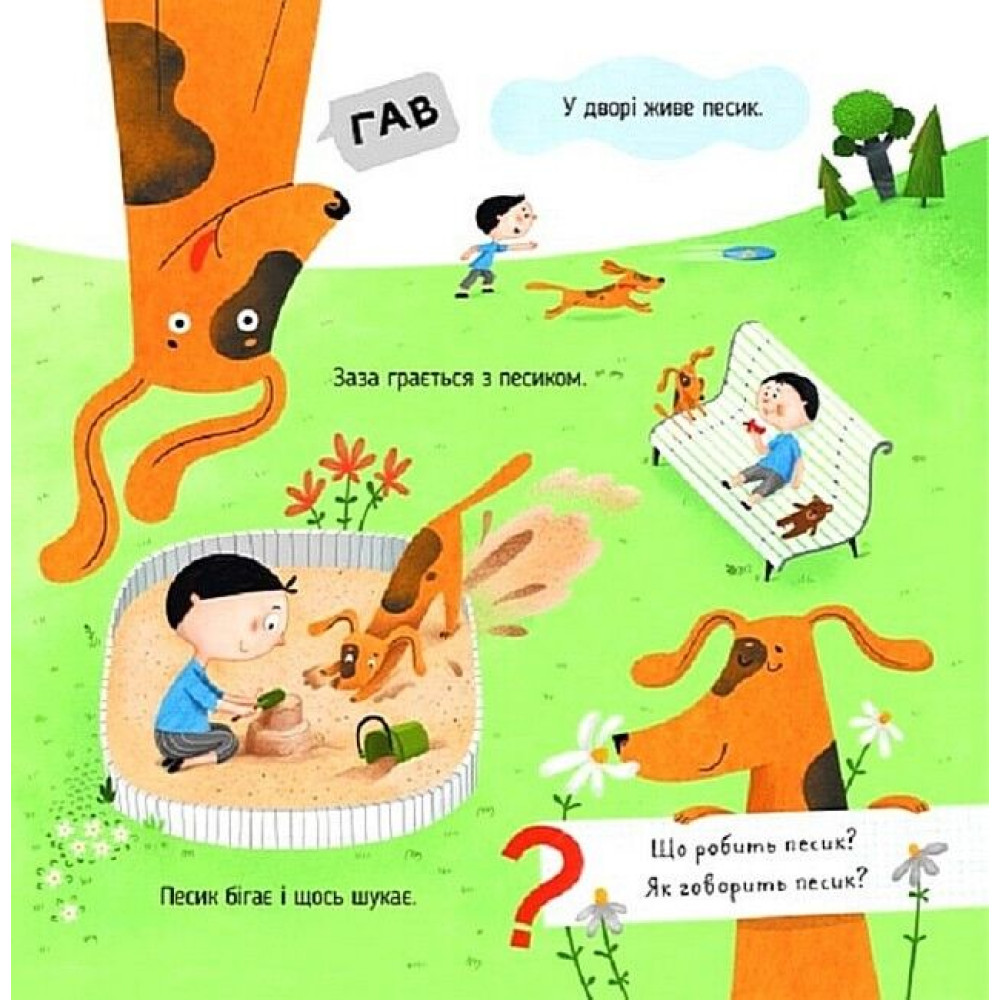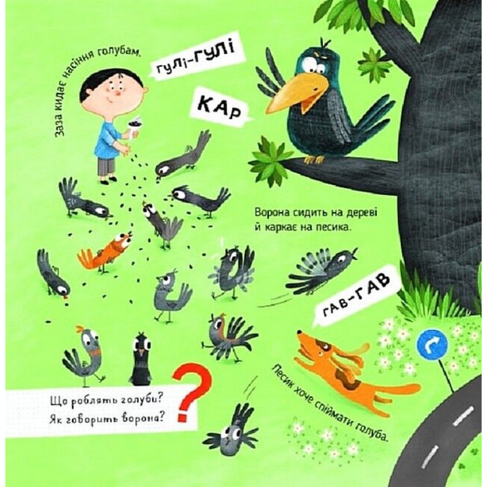Книжка видає звуки голосом читця, тож батьки мають взяти участь у її читанні з дитиною. Коли саме дитина починає говорити: у 6, 10, 11 чи 18 місяців? Ми не можемо сказати напевно, бо це індивідуально. Але точно знаємо, як дитина вчиться говорити: через звуконаслідування. І ця книжка їй допоможе. Та вона містить не просто звуки, які можна наслідувати, а ще й маленькі історії. З цією книжкою дитина радіє, повторюючи звуки за тваринами, і водночас спостерігає актуальні для неї ситуації. Видання сприяє розвитку мовлення на чотирьох рівнях. На першому рівні дитина повторює, як кажуть тваринки, на другому — розповідає, що роблять тваринки. На третьому рівні батьки, проговорюючи назви об’єктів та звуки, які вони видають, указують на виділений на сторінках текст — і дитина запам’ятовує, як слова записуються літерами. Четвертий рівень — це перше читання.