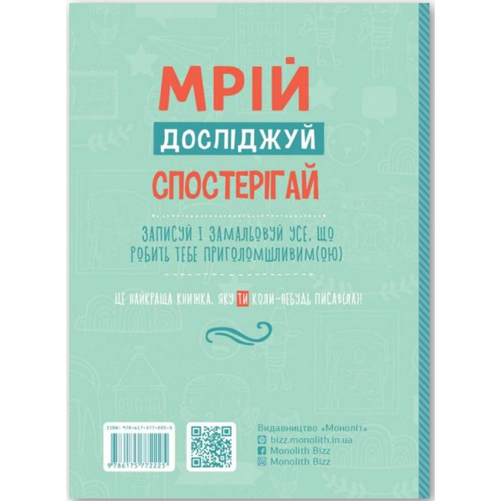 «Пиши тут, пиши зараз» - це творчий блокнот для дітей у віці від 8 до 12 років. Він допомагає краще зрозуміти себе, задуматися про важливі речі в ігровій формі і записувати цікаві думки на папері. Книжка надихає маленьких письменників, художників, колекціонерів, винахідників і дослідників відкривати свої таланти і розвивати їх.У цьому блокноті ти зможеш:скласти список бажань.дізнатися про себе по своєму почерку.записати слова улюбленої пісні.намалювати комікс.краще познайомитися з собою.пограти в супергероя.зробити провісник долі.побороти свої страхи.познайомитися з собою в майбутньому. Ця книга для дітей, які люблять творчі блокноти! І для батьків, які хочуть допомогти своїм дітям краще зрозуміти себе.
