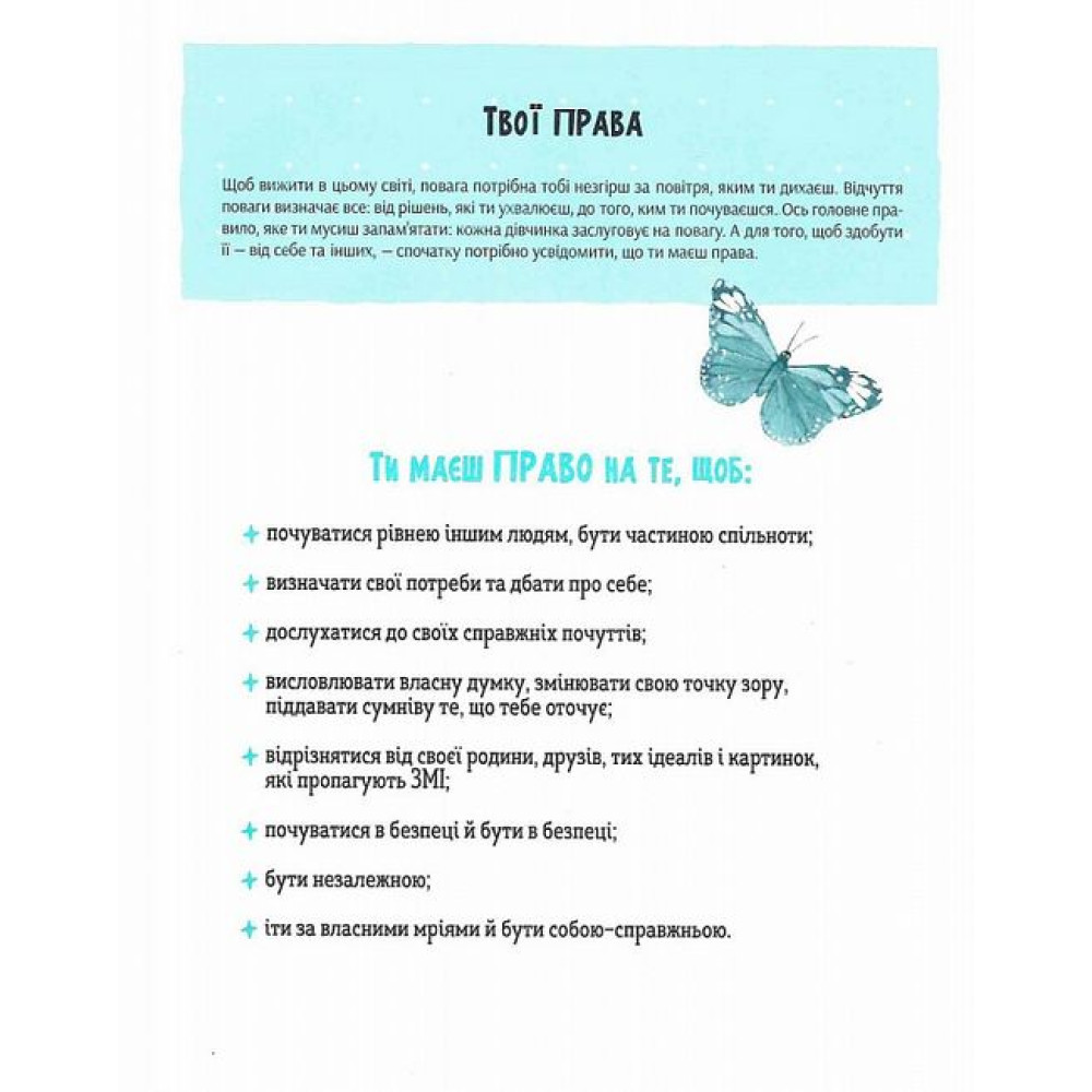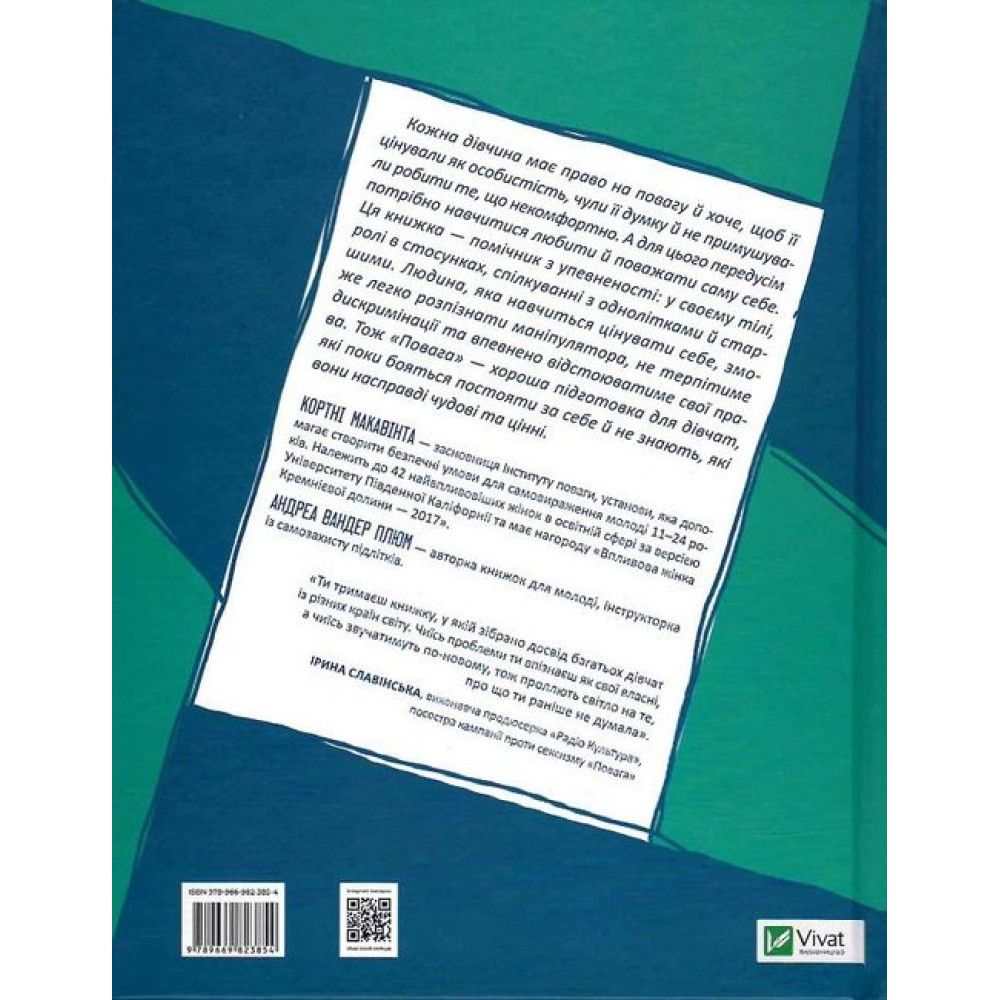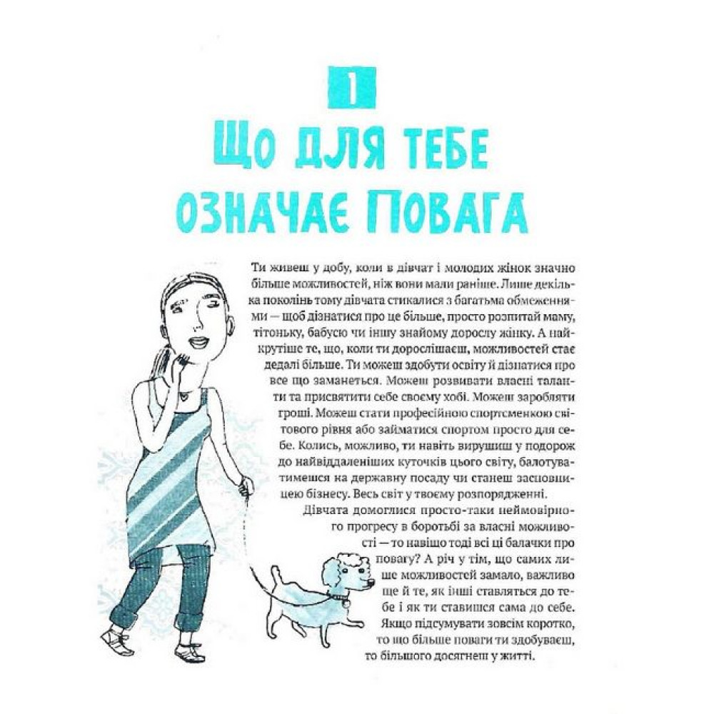 Кожна дівчина має право на повагу й хоче, щоб її цінували як особистість, чули її думку й не примушували роботи те, що некомфортно. А для цього передусім потрібно навчитися любити й поважати саму себе. Ця книжка — помічник з упевненості в собі: у своєму тілі, ролі у стосунках, спілкуванні з однолітками й старшими. Людина, яка навчиться цінувати себе, зможе легко розпізнати маніпулятора, не терпітиме дискримінації та впевнено відстоюватиме свої права. Тож «Повага» — хороша підготовка для дівчат, які поки бояться постояти за себе й не знають, які вони насправді чудові й цінні.