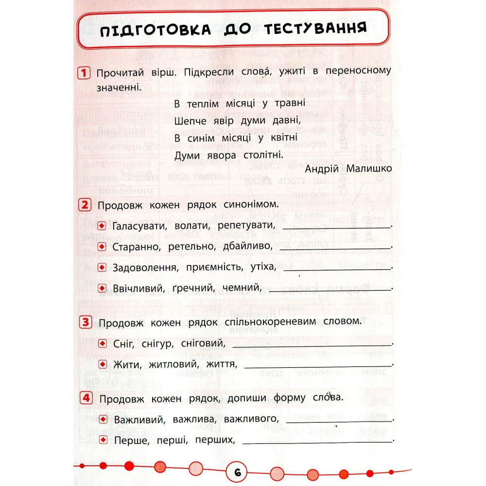 Ця книга допоможе учням четвертого класу успішно підготуватися до тестових підсумкових завдань у молодшій школі. У виданні міститься довідковий матеріал до кожної теми, підготовчі вправи (завдання з відкритою формою відповіді та творчі завдання), а також тематичні тести. Кожен розділ упорядковано відповідно до нової програми Міністерства освіти і науки України.