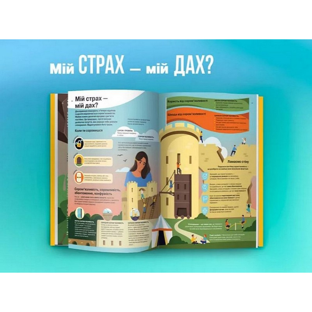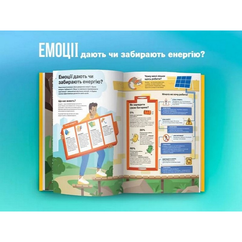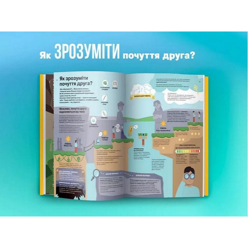 У цій книжці ми зібрали все, що потрібно знати про почуття і як із ними жити. Як зрозуміти, що ти відчуваєш? Це буває складно для кожного з нас. Ще складніше усвідомити, що робити із почуттями. Як ними ділитися? Як будувати взаємини, не ображаючи і не ображаючись? Чи варто показувати злість? Звідки черпати радість і щастя? Що таке любов до себе і як її вирощувати? Короткі візуальні відповіді на найголовніші питання, простою і зрозумілою навіть дитині мовою. Менше слів — більше сенсу!Успіх в особистій та соціальній сферах життя на 80% визначається рівнем розвитку емоційного, і лише на 20% — рівнем класичного інтелекту. Саме емоційний інтелект перетворює звичайних людей на яскравих, привабливих та харизматичних. «Що ж це таке – емоційний інтелект?» — запитайте ви. Це і емпатія, і адекватна самооцінка, і вміння знаходити спільну мову з оточенням, і багато іншого. Діти, які мають емоційний інтелект, безперечно стають лідерами в будь-яких сферах, вони здатні організувати громадську діяльність, вирішити проблеми, взяти на себе відповідальність і тому в майбутньому з легкістю зможуть досягти будь-яких вершин. Спеціально для юних бунтарів, сором’язливих, чутливих і всіх-усіх-усіх, кому важливо розвинути емоційний інтелект, ми підготували книжку інфографік «Я відчуваю… Що?», присвятивши її емоціям, які в пубертатний період часто домінують над підлітком і стають каменем спотикання у взаєминах із собою та оточенням. Ми докладно розібрали, як розпізнати їх, прийняти і прожити конструктивно. Одного разу взявши до рук цю книжку, ви не зможете відкласти її і не читати. Вже вдруге ми виконали нездійсненне завдання, помістивши таку широку тему у 108 яскравих сторінок із незабутніми образами, які назавжди залишаться з вашою дитиною. Ось повний список тем, що увійшли до книжки: Що таке почуття узагалі? — Почуття й емоції — що це? — Навіщо ми відчуваємо? — Як виникає почуття? — Я — це мої почуття й емоції? — Емоції дають чи забирають енергію? Які бувають почуття? — Я не розумію, що відчуваю — Як читати емоції за тілом? — А емоції бувають «поганими» чи «хорошими»? — Чи можна відчувати лише те, що приємно? Я відчуваю... — Я відчуваю злість — (Не) відчуваю радості? — Соромлюся і звинувачую себе — Сумний та невеселий — Емоції «Фу-у-у» — Мені тривожно, я боюся — Мій страх — мій дах? — Ну-у-удно! — Овва! Ось це так! — Мені так прикро! — Де живе кохання? — Одразу багато емоцій — як розібратися? Що робити із почуттями? — Чи можна сховатися від почуттів? — Просто зупинитись і спостерігати? Серйозно? — Як же бути з емоцією: визнай і відпусти — Хто живе у твоїй голові: критик чи вболівальник? — Лабораторія почуттів: що ще на мене впливає? — Моє тіло й емоції пов’язані? — А що для тебе «щастя»? — Як говорити про свої почуття? Що відчувають інші? — Розумію себе, розумію — інших? — Як зрозуміти почуття друга? — Як полагодити дружбу, коли ви скривджені? — Як виявляти любов і турботу? Вивчи мову! — Що відчувають батьки? — Як ми переживаємо разом — «Інший» — отже, «кепський» чи «небезпечний»? — Як спілкуватись, щоб не завдати душевного болю іншим?