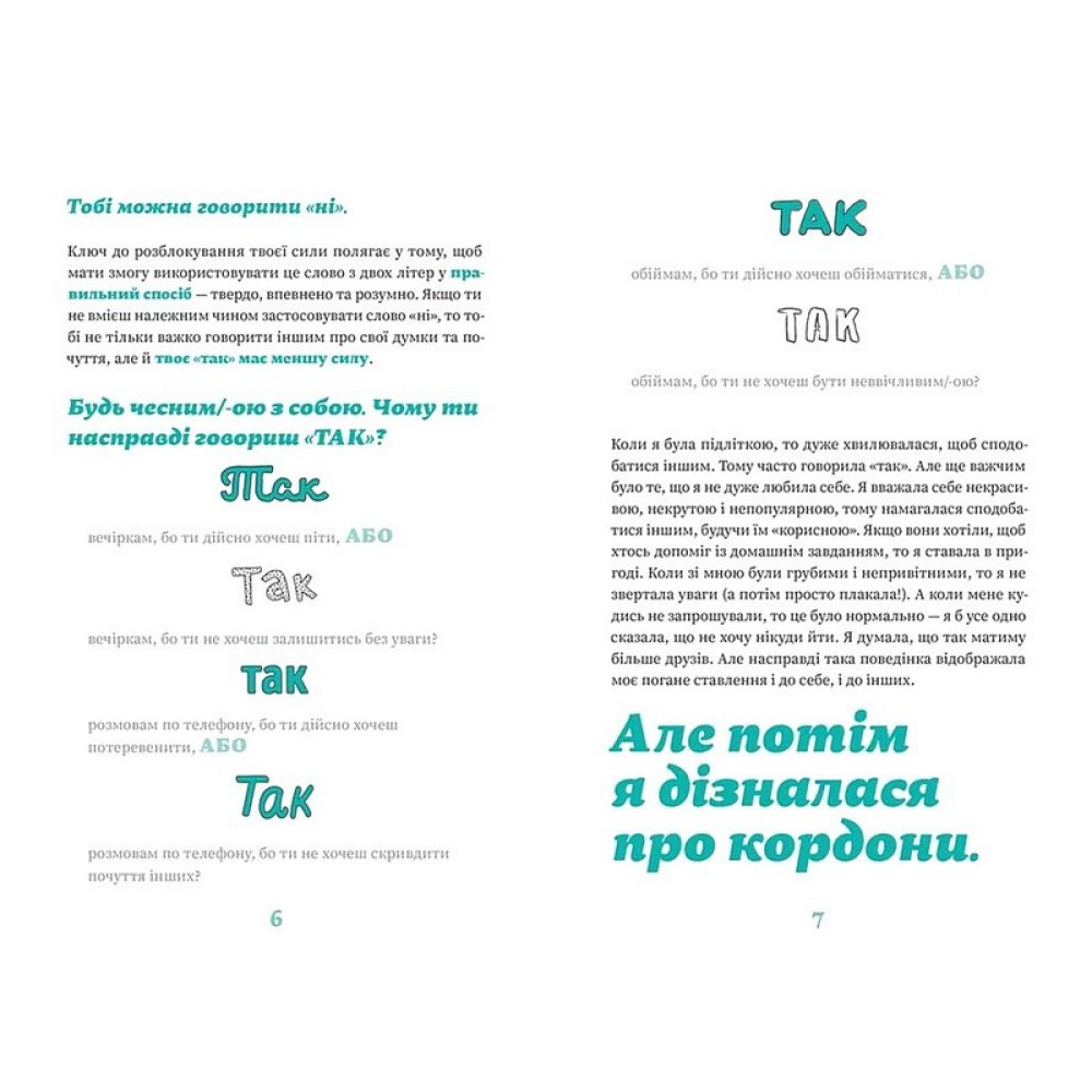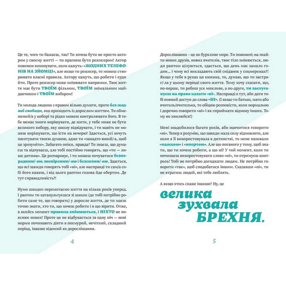 З дитинства нас вчать бути ввічливими і зважати на почуття інших. Проте важливо також зважати на власні почуття і не давати іншим ображати тебе, змушувати щось робити, коментувати твою зовнішність чи вбрання, обіймати чи торкатися тебе без твоєї згоди. Щоб навчитися захищати себе, потрібно вибудувати власні кордони. Як це зробити? Насамперед навчитися казати «ні» — стверджує авторка цієї книжки, лайф-коуч Мішель Елман. Легко і невимушено Мішель пояснює, як підліток може протистояти тиску, бодішеймінгу і порушенню власних кордонів у родині, у школі, в колі друзів та в інтернеті. Застосовуючи поради авторки, підлітки стануть сильнішими та впевненішими в собі.