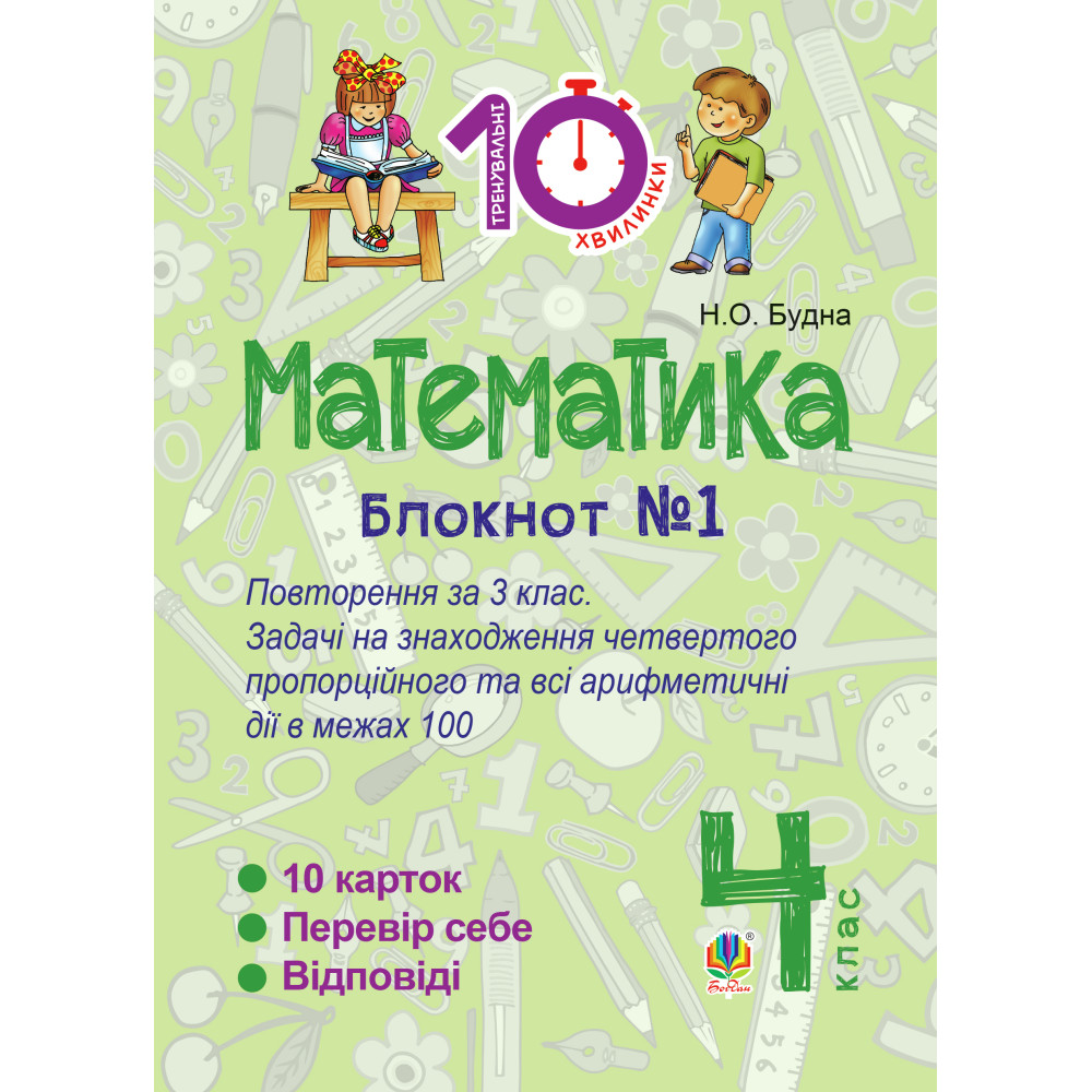 Пропонований посібник входить до серії 14-ти блокнотів «Тренувальні 10-хвилинки», мета яких — закріпити обчислювальні навички та вміння розв’язувати рівняння, нерівності, задачі учнями 4-го класу. Блокнот містить картки з вправа ми та завданнями, розрахованими на 10-хвилинне виконання, а також підсумковий контроль знань «Перевір себе» з навчальної теми та відповіді для самоперевірки. Посібник зручний у використанні. Працювати з ним можна не лише в школі чи вдома, а й під час подорожі, відпочинку на природі. Для учнів 4-х класів, учителів та дбайливих батьків.