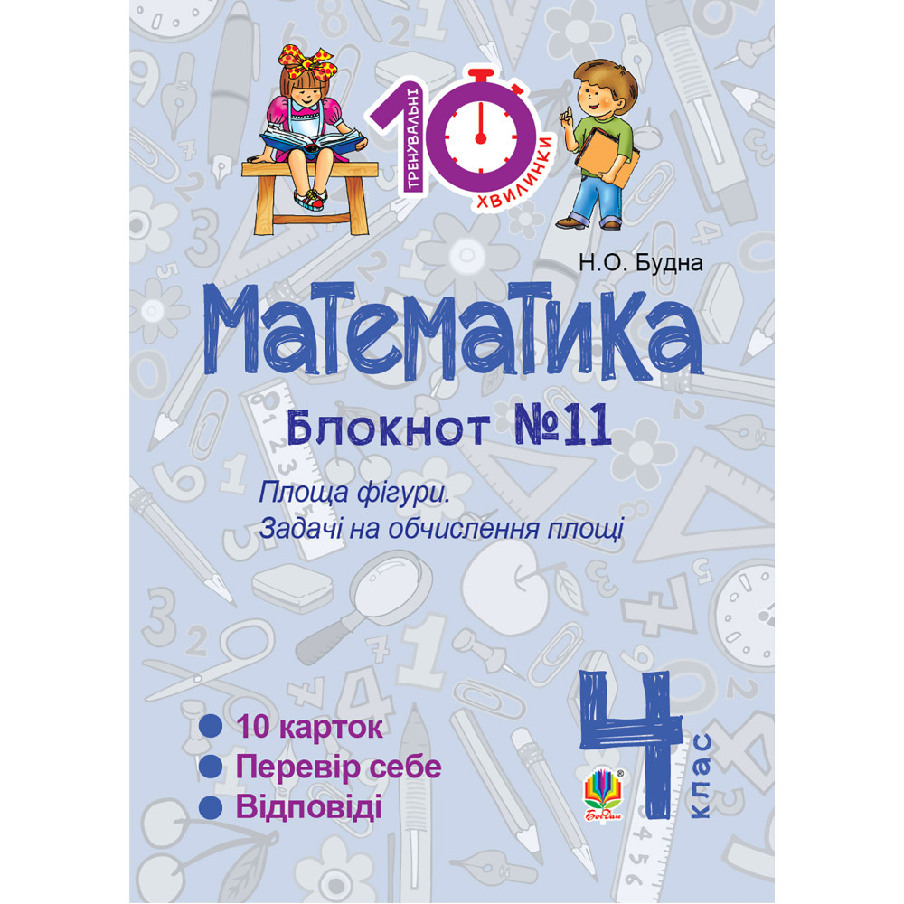 Пропонований посібник входить до серії 14-ти блокнотів «Тренувальні 10-хвилинки», мета яких — закріпити обчислювальні навички та вміння розв’язувати рівняння, нерівності, задачі учнями 4-го класу. Блокнот містить картки з вправа ми та завданнями, розрахованими на 10-хвилинне виконання, а також підсумковий контроль знань «Перевір себе» з навчальної теми та відповіді для самоперевірки. Посібник зручний у використанні. Працювати з ним можна не лише в школі чи вдома, а й під час подорожі, відпочинку на природі. Для учнів 4-х класів, учителів та дбайливих батьків.