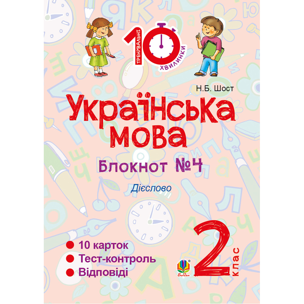 Пропонований посібник входить до серії блокнотів «Тренувальні 10-хвилинки», мета яких — забезпечити практичне засвоєння та закріплення учнями 2-го класу найголовніших орфоепічних та орфографічних правил української мови. Блокнот містить картки з вправами та завданнями, розрахованими на 10-хвилинне виконання, а також підсумковий тест-контроль знань з навчальної теми та відповіді для самоперевірки. Посібник зручний у використанні. Працювати з ним можна не лише в школі чи вдома, а й під час подорожі, відпочинку на природі. Для учнів 2-х класів, учителів та дбайливих батьків.