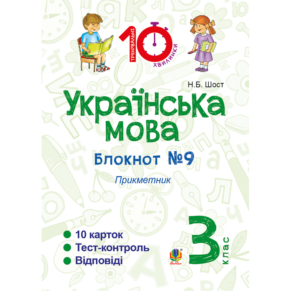 Пропонований посібник входить до серії 10-ти блокнотів «Тренувальні 10-хвилинки», мета яких — забезпечити практичне засвоєння та закріплення учнями 3-го класу найголовніших орфоепічних та орфографічних правил української мови. Блокнот містить картки з вправами та завданнями, розрахованими на 10-хвилинне виконання, а також підсумковий тест-контроль знань з навчальної теми та відповіді для самоперевірки. Посібник зручний у використанні. Працювати з ним можна не лише в школі чи вдома, а й під час подорожі, відпочинку на природі. Для учнів 3-х класів, учителів та дбайливих батьків.
