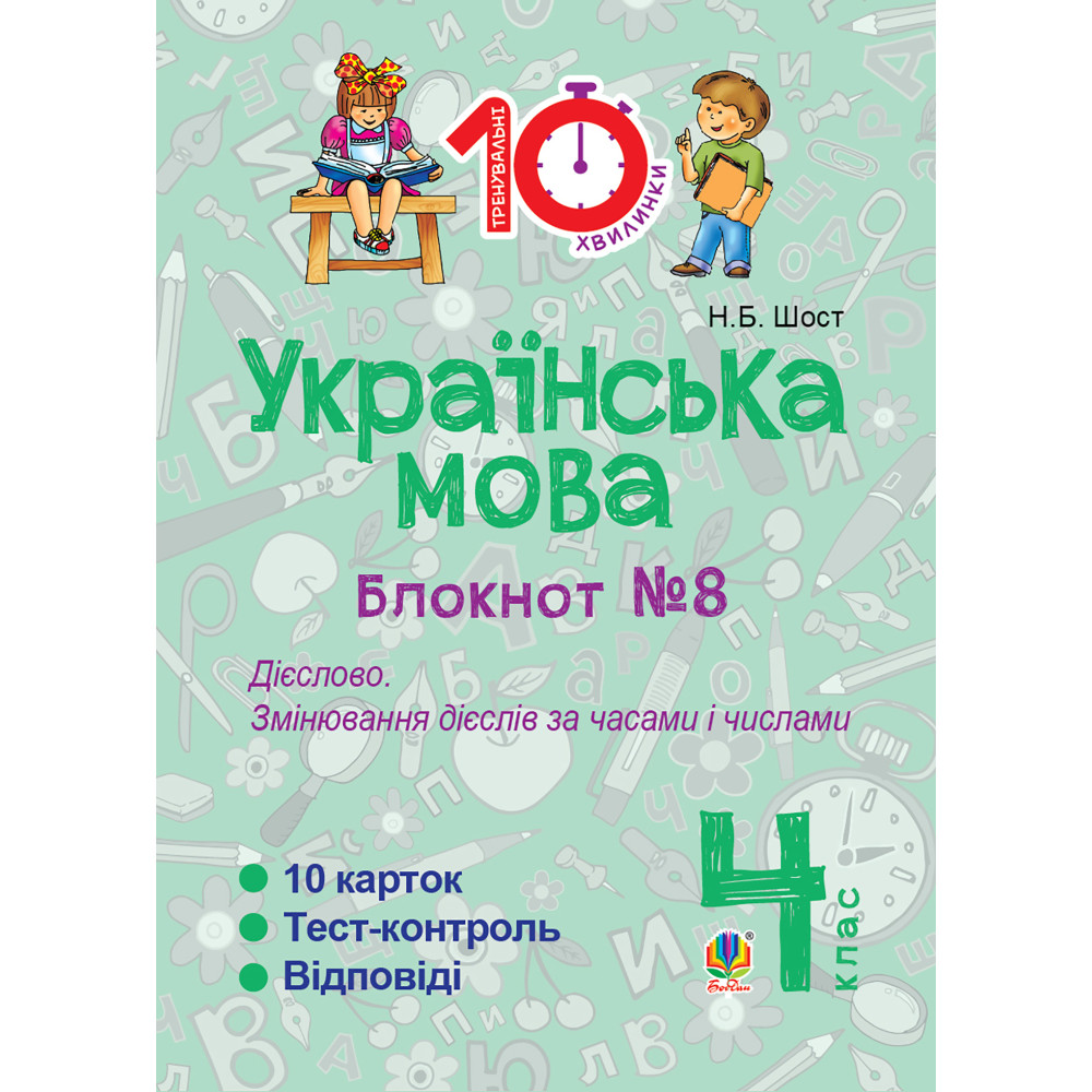 Пропонований посібник входить до серії 12-ти блокнотів «Тренувальні 10-хвилинки», мета яких — забезпечити практичне засвоєння та закріплення учнями 4-го класу найголовніших орфоепічних та орфографічних правил української мови. Блокнот містить картки з вправами та завданнями, розрахованими на 10-хвилинне виконання, а також підсумковий тест-контроль знань з навчальної теми та відповіді для самоперевірки. Посібник зручний у використанні. Працювати з ним можна не лише в школі чи вдома, а й під час подорожі, відпочинку на природі. Для учнів 4-х класів, учителів та дбайливих батьків.