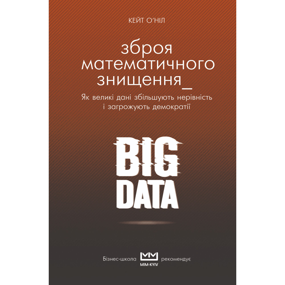 Великі дані або BIG DATA мають багато фанатів, але авторка цієї книжки до них не належить. «BIG DATA. Зброя математичного знищення» про те, яку шкоду завдають алгоритми, як від великих даних залежить життя людей, і яке майбутнє чекає на нас усіх. Кейт О’Ніл дослідила ті випадки, коли люди страждали і зазнали невдачі у важливі моменти життя саме через BIG DATA: під час вступу в коледж, при спробах взяти кредит, при винесенні вироку в суді, при пошуку роботи.