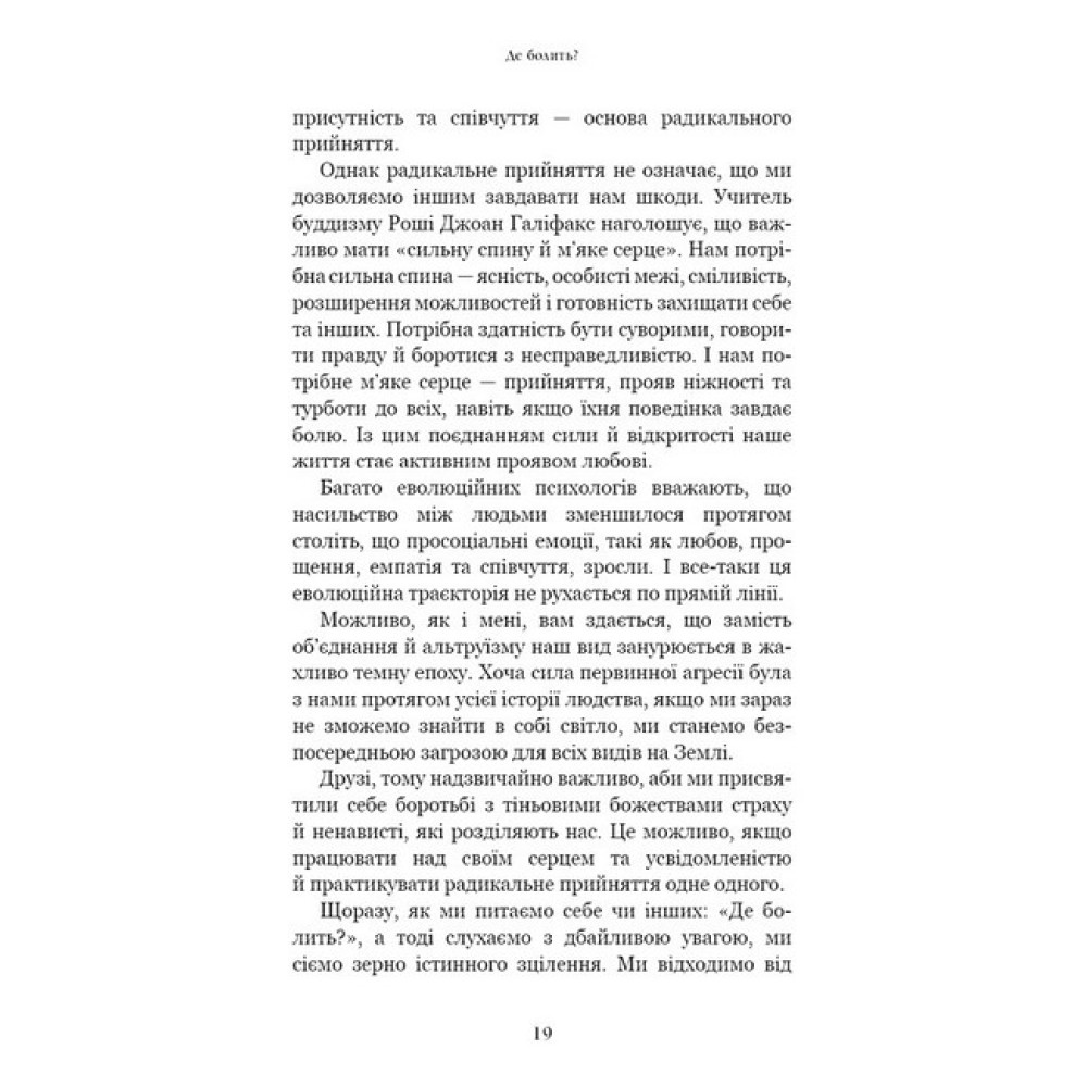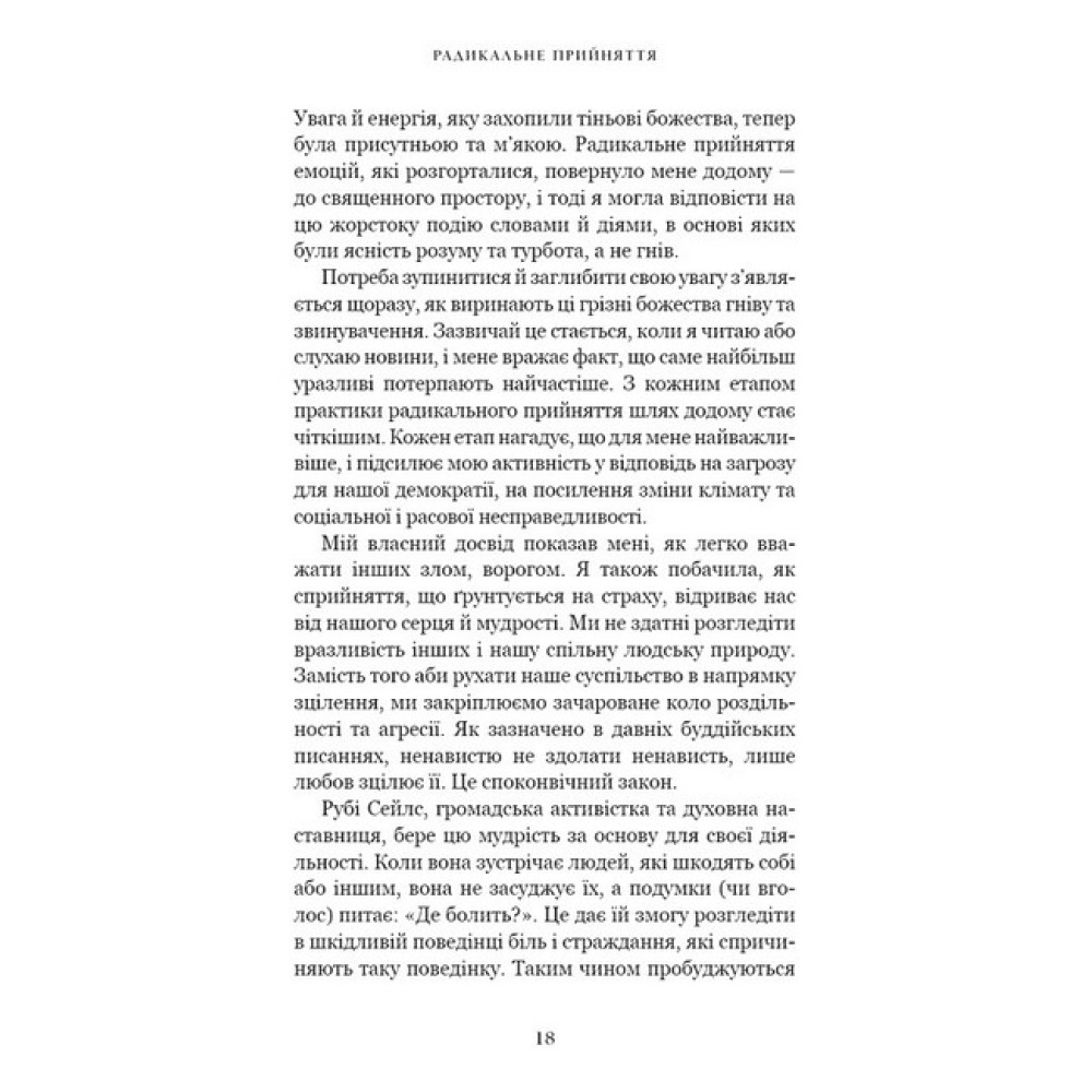 У нинішні часи глобальних криз і різкого зростання колективної тривоги трансформаційна практика Тари Брах «Радикальне прийняття» пропонує шлях до внутрішньої свободи. Ми часто думаємо, що з нами щось не так, бо маємо проблеми зі стосунками, самотністю, роботою, самовираженням, залежностями тощо. Особливо гостро це відчувається тоді, коли ми бачимо інших — щасливіших, успішніших і досконаліших. У цій книзі містяться вказівники, які проведуть шляхом звільнення від негативного самосприйняття, — конкретні й чіткі поради, що ґрунтуються на практичному досвіді докторки Брах з упровадження буддистських практик у рутинну терапію. Вона показує нам, як ми можемо перестати воювати із самими собою і почати повноцінно проживати кожен дорогоцінний момент нашого життя.