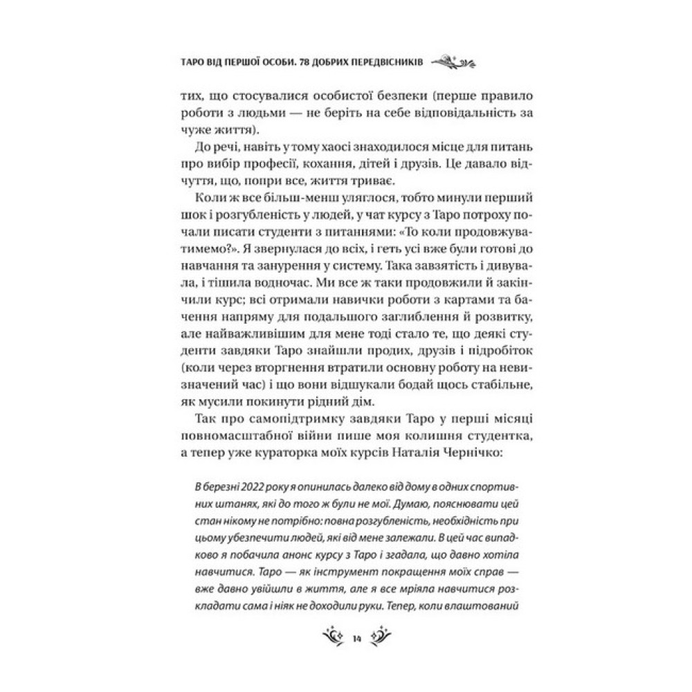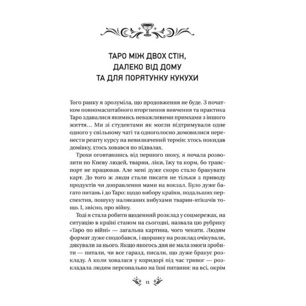Із цією книгою химерний світ Таро стане для вас простим і зрозумілим. Сутність кожної карти, її символічне значення, детальне авторське тлумачення енергій і архетипів завжди напохваті. Здобуті знання як провідна зірка освітлюватимуть шлях, даючи вам і новий напрям, і надію, і право бути розвідником для інших. Як показала практика однієї «відьми», аркани можуть стати тими друзями, які ніколи не зрадять і завжди відповідають на запити кверентів. Для кращого розуміння мови Таро наведено глосарій.