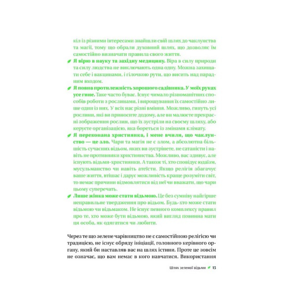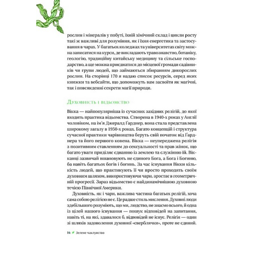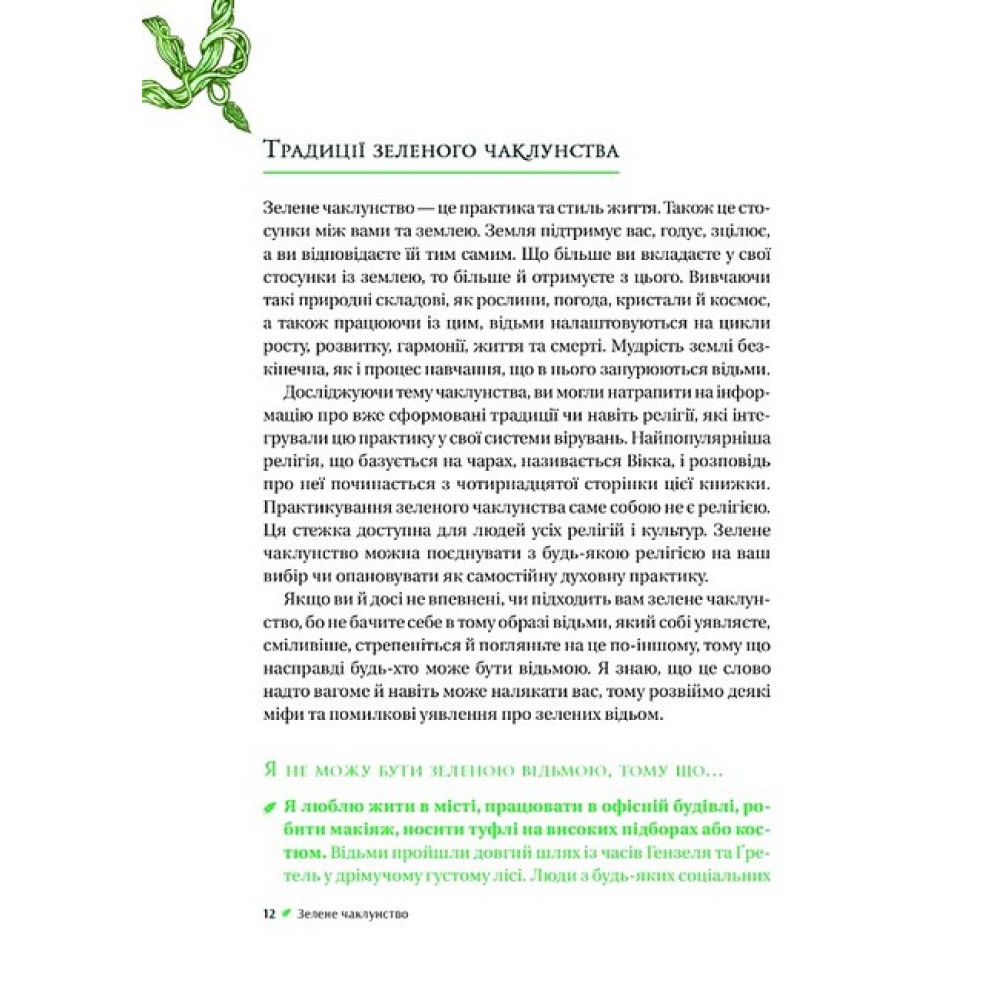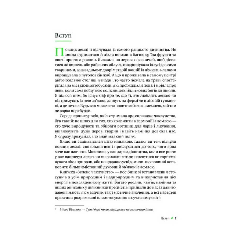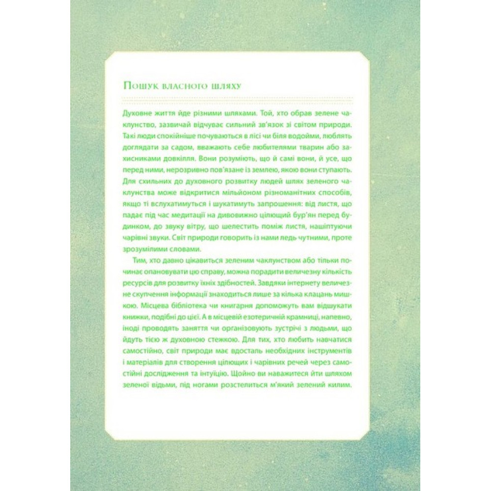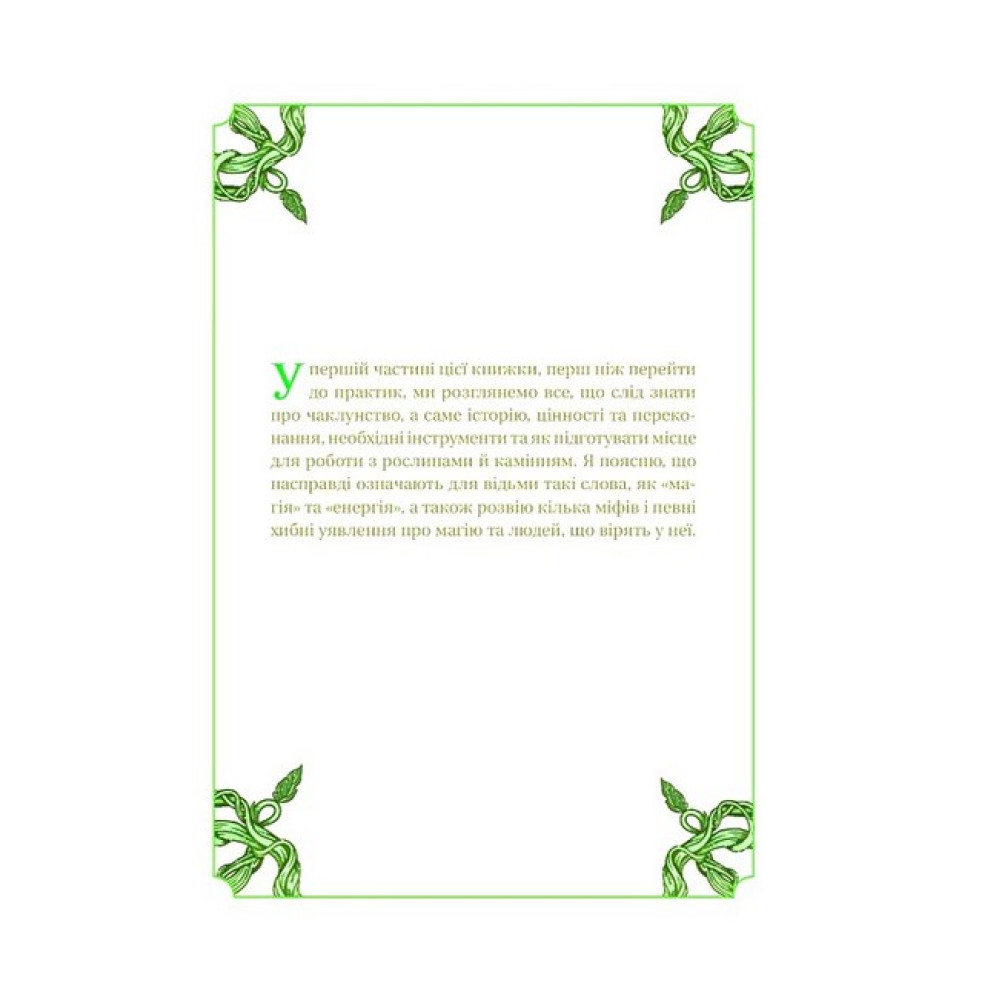 У ваших руках практичний посібник із зеленого чаклунства, який допоможе встановити або посилити зв’язок із рослинами, квітами та камінням. Бо що більше ви віддаєте землі, то більше від неї натомість отримуєте. І вам не треба відмовлятися від своїх принципів і вподобань: віри в науку, медицину, Бога, життя у великому місті чи ділового костюма. Магія — це природна енергія уяви, натхнення та інтуїції, яка живить ваші мрії та прагнення. Тож ваше завдання — навчитися використовувати цю енергію собі на користь. Вам знадобляться кілька перевірених відьомською спільнотою заклинань, кристали, нескладні інструменти та трішки допитливості. І пам’ятайте: будь-хто може стати зеленою відьмою або зеленим відьмаком.
