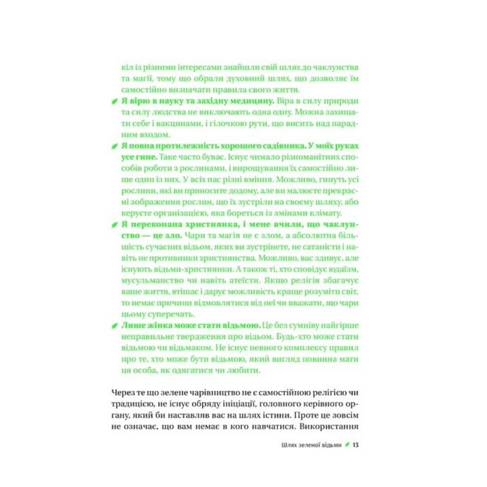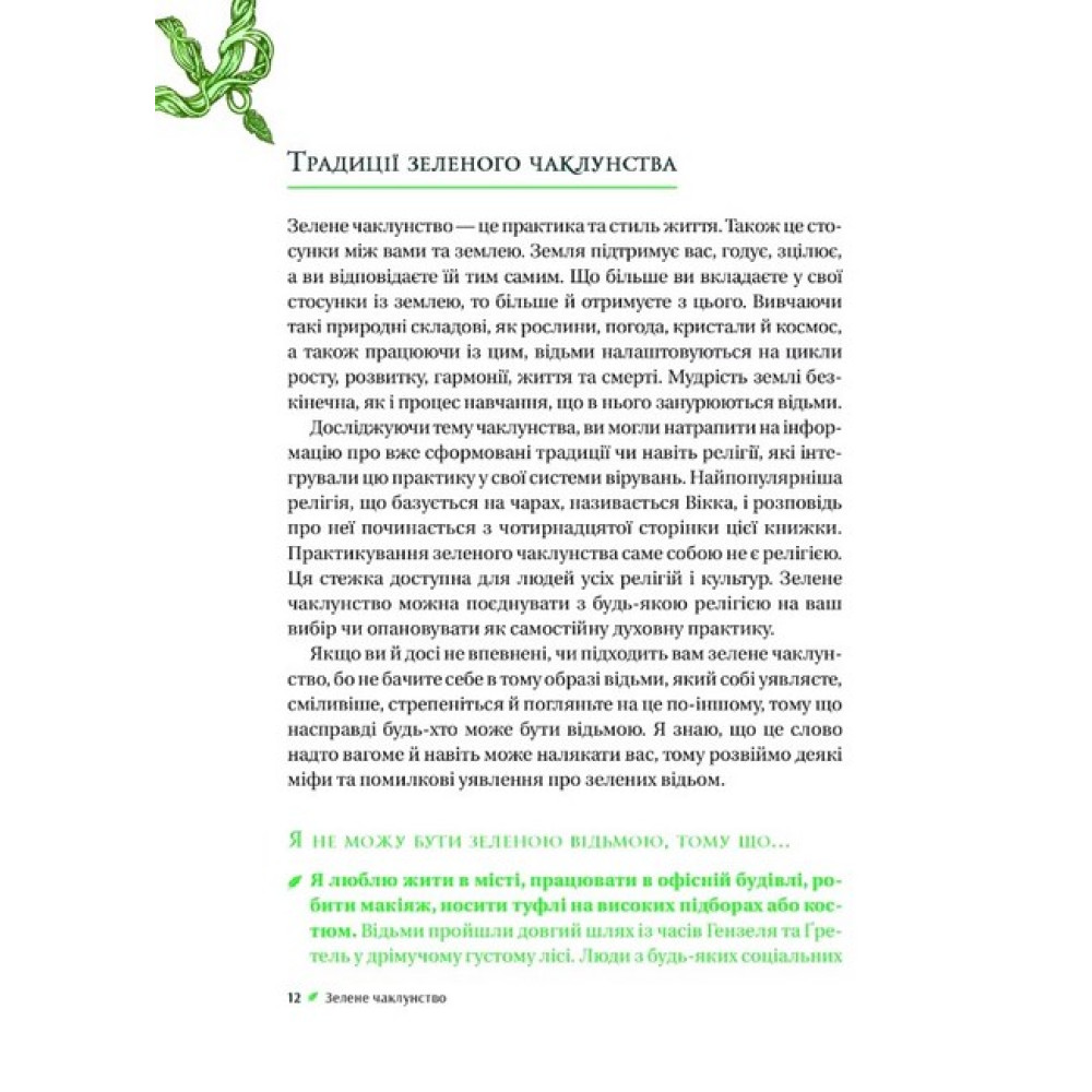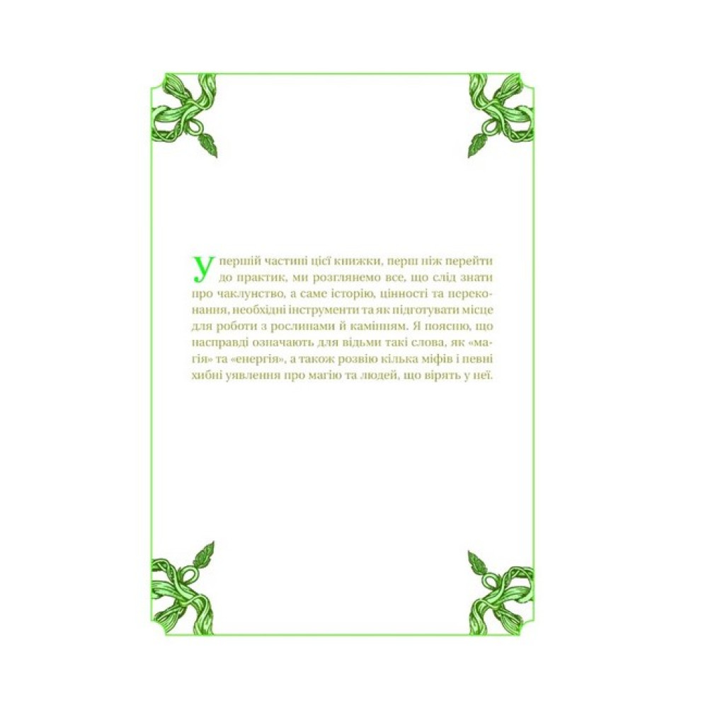 У ваших руках практичний посібник із зеленого чаклунства, який допоможе встановити або посилити зв’язок із рослинами, квітами та камінням. Бо що більше ви віддаєте землі, то більше від неї натомість отримуєте. І вам не треба відмовлятися від своїх принципів і вподобань: віри в науку, медицину, Бога, життя у великому місті чи ділового костюма. Магія — це природна енергія уяви, натхнення та інтуїції, яка живить ваші мрії та прагнення. Тож ваше завдання — навчитися використовувати цю енергію собі на користь. Вам знадобляться кілька перевірених відьомською спільнотою заклинань, кристали, нескладні інструменти та трішки допитливості. І пам’ятайте: будь-хто може стати зеленою відьмою або зеленим відьмаком.