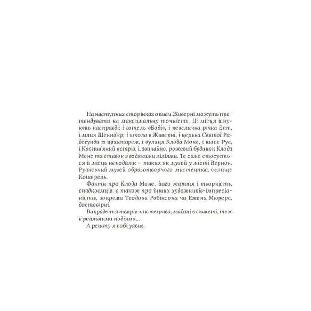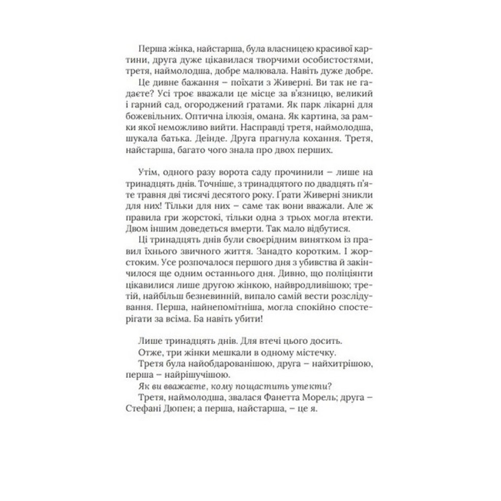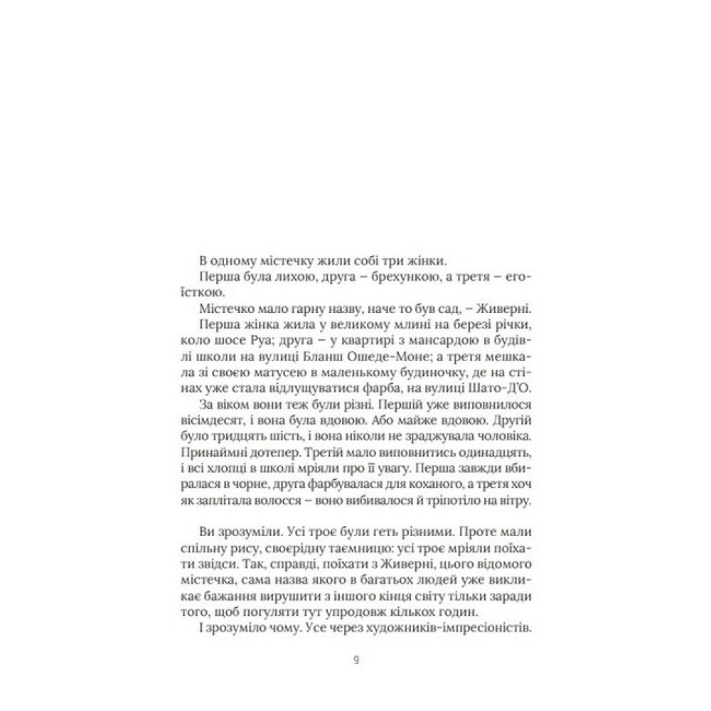 У Живерні, улюбленому містечку Клода Моне, зазвичай тихому і спокійному, сталося вбивство… В основі сюжету — життя трьох жінок: дівчинки-художниці, молодої чарівної вчительки й старенької пані, яка бачить і знає все. Усі троє геть різні, проте їх об’єднує одна таємниця: вони мріють назавжди поїхати звідси. Та чи так легко покинути свою золоту клітку? До того ж містечком ширяться чутки про викрадені картини Моне, серед яких нібито має бути відоме полотно — «Водяні лілії» в чорних тонах. І на тлі всього цього вирує руйнівна пристрасть…
