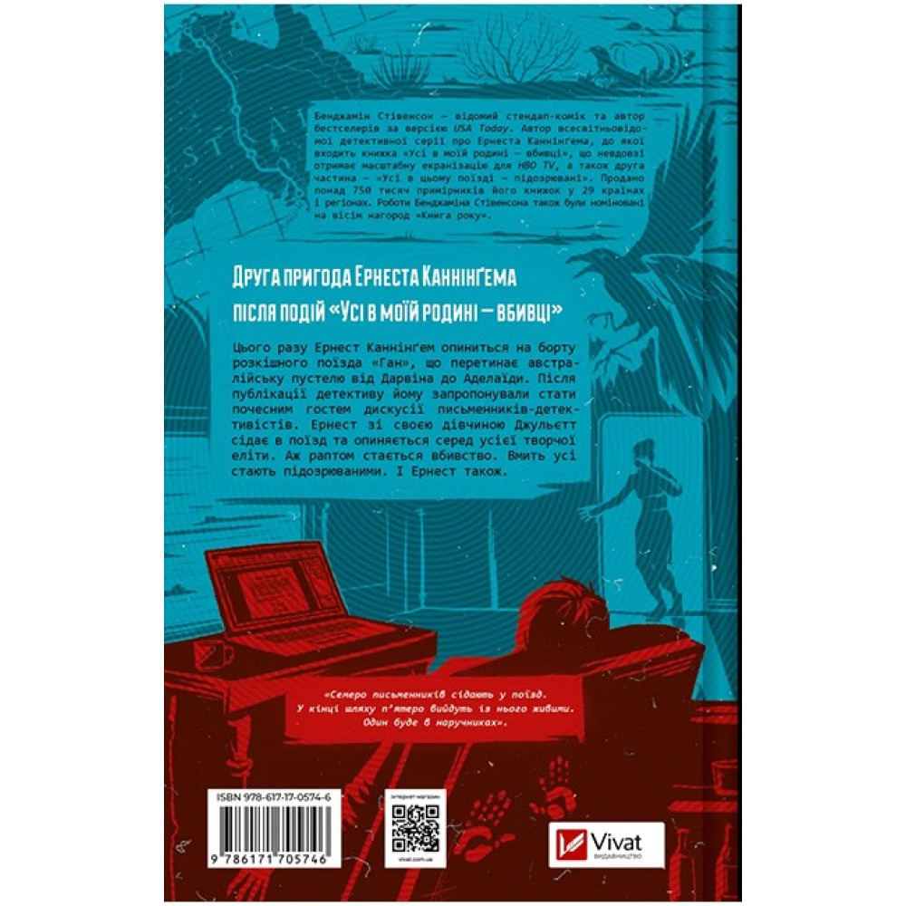 Цього разу Ернест Каннінґем опиниться на борту розкішного поїзда «Ган», що перетинає австралійську пустелю від Дарвіна до Аделаїди. Після публікації детективу йому запропонували стати почесним гостем дискусії письменників-детективістів. Ернест зі своєю дівчиною Джульєтт сідає в поїзд та опиняється серед усієї творчої еліти. Аж раптом стається вбивство. Вмить усі стають підозрюваними. І Ернест також. «Семеро письменників сідають у поїзд. У кінці шляху п’ятеро вийдуть із нього живими. Один буде в наручниках».