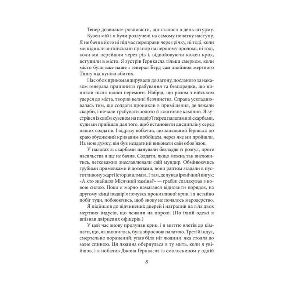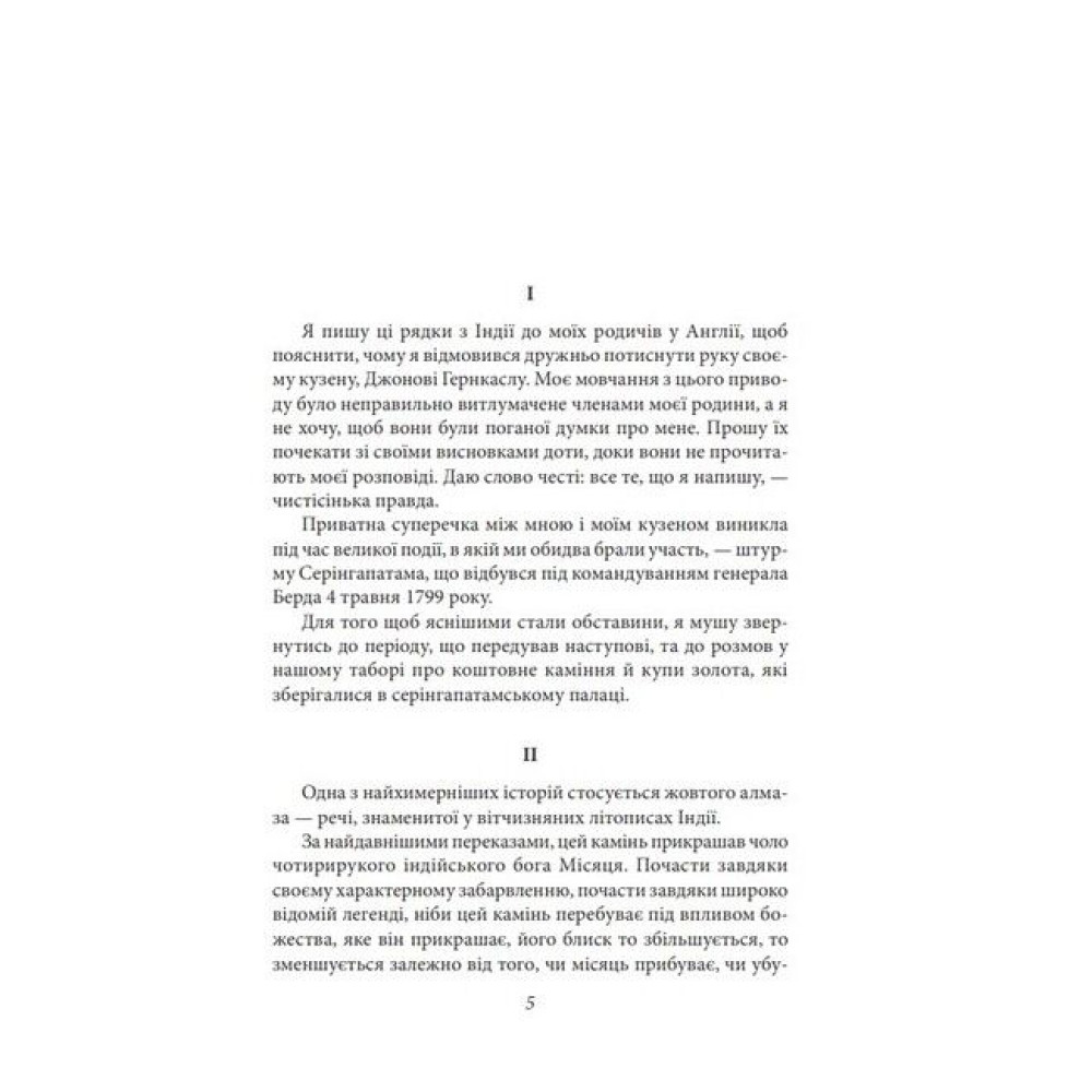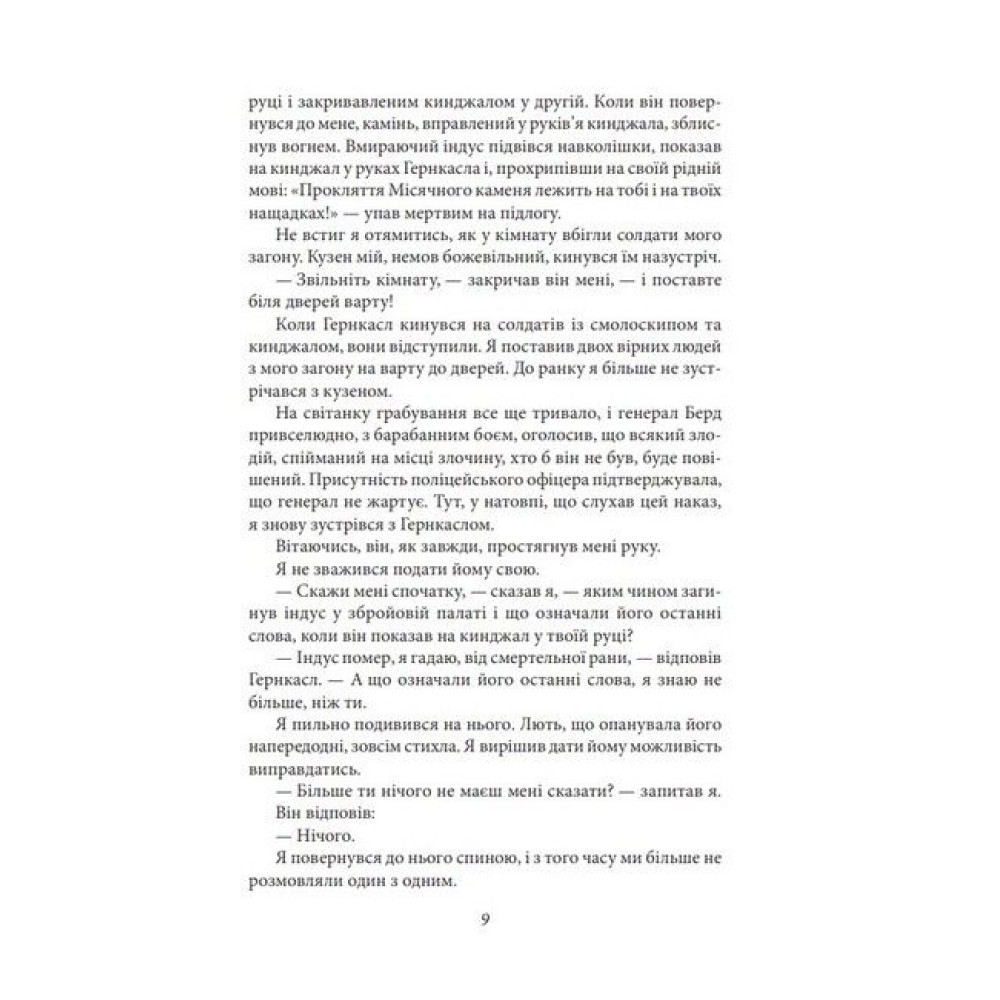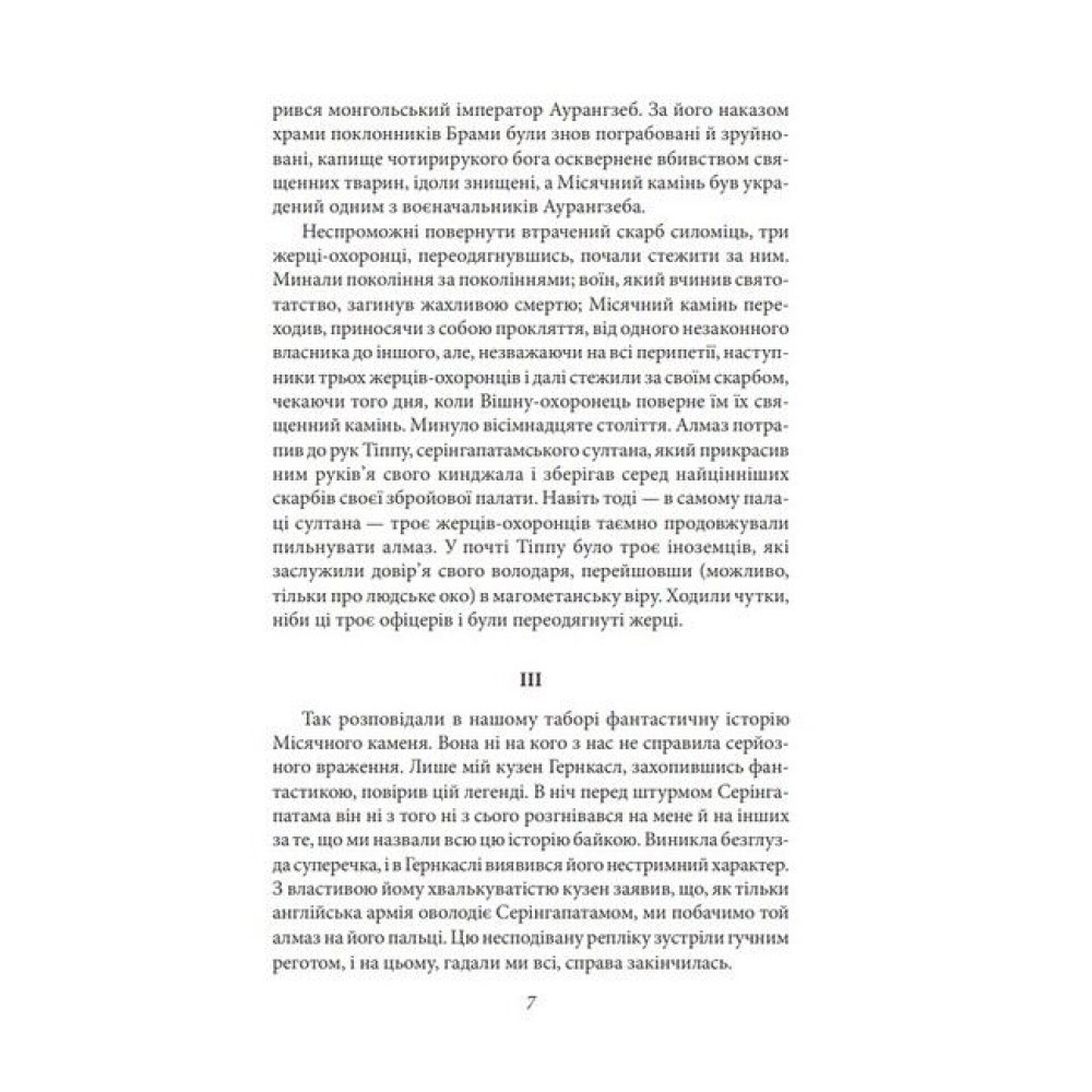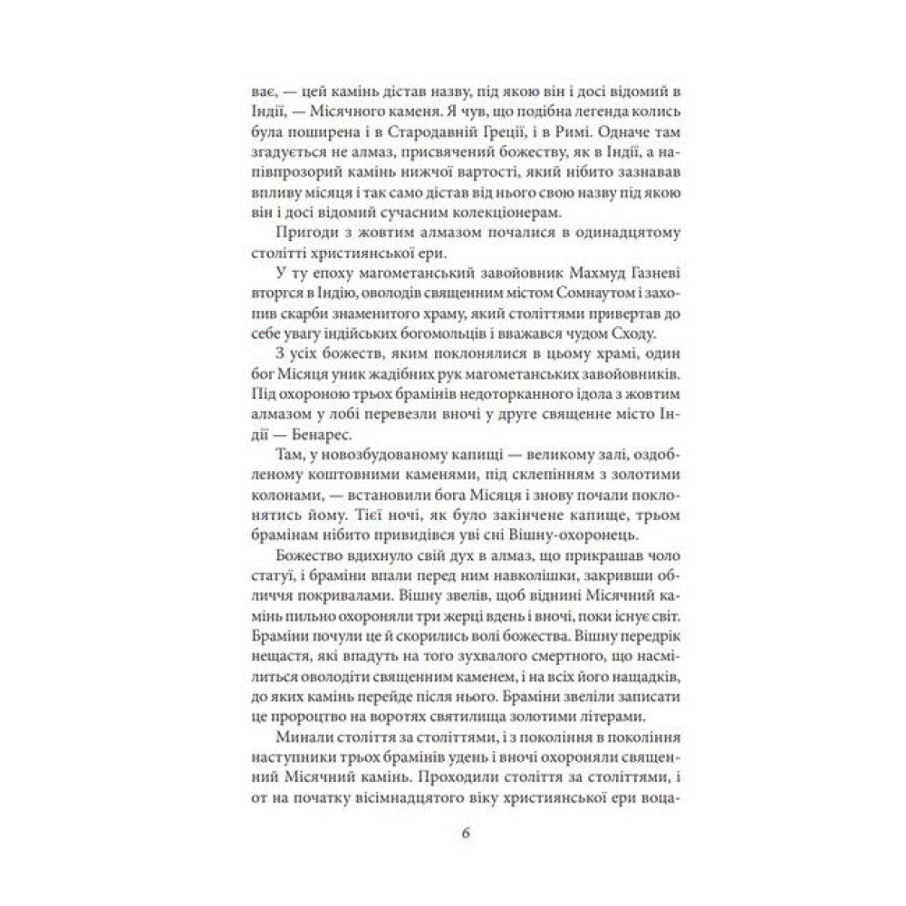 Вілкі Коллінз (1824—1889) по праву вважається засновником англійського детектива і літературним учителем Артура Конан Дойла, Гілберта Честертона, Агати Крісті. Майстер інтриг і захоплюючого сюжету, він написав понад сто творів, які цікаві не тільки неоднозначністю персонажів, умінням розгадувати таємниці, розкривати злочини, а й тонким англійським гумором, описом звичаїв доброї старої Англії. Шедеври Коллінза «Жінка у білому» і «Місячний камінь» перекладені на десятки мов, багаторазово екранізовані й дотепер улюблені читачами. «Місячний камінь» вважається чи не першим детективним романом. Це таємнича романтична історія, в якій є місце і любові, й пригодам, і детективній інтризі. Молода дівчина, Речел Веріндер, згідно із заповітом свого дядька, який воював в Індії, отримує в день повноліття великий алмаз надзвичайної краси. Вона не знає, що Місячний камінь (таку назву має алмаз) викрадений з індійського святилища і три індуських жерці йдуть по його сліду, а індуїстський бог Вішну передбачив нещастя тому, хто наважиться їм заволодіти. Вночі камінь безслідно зникає...