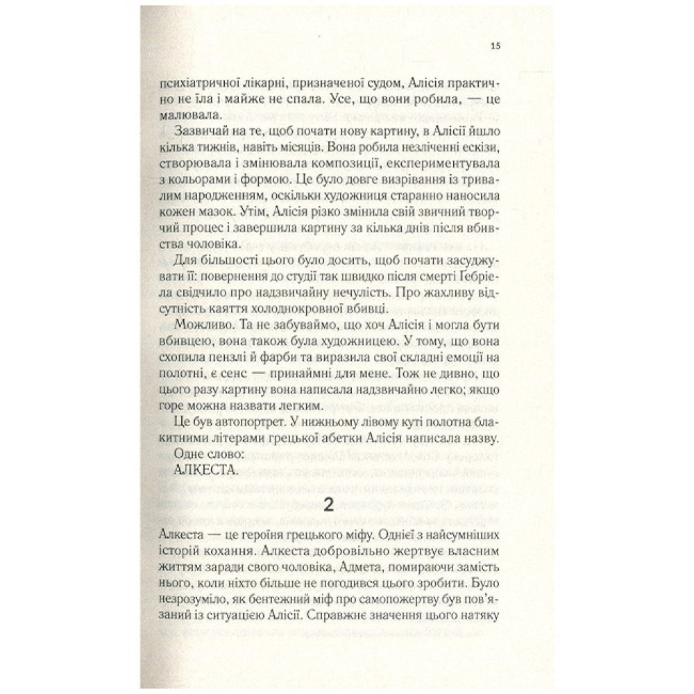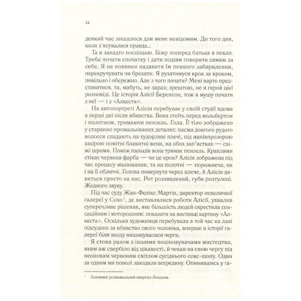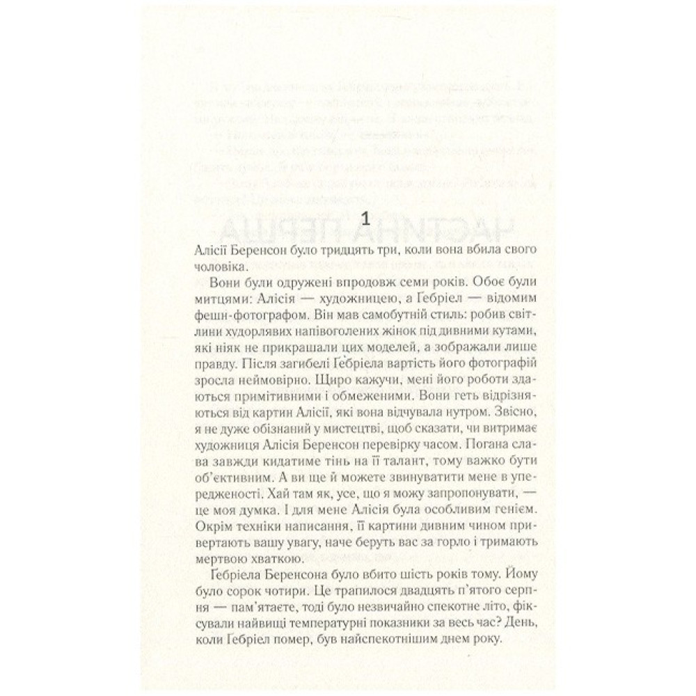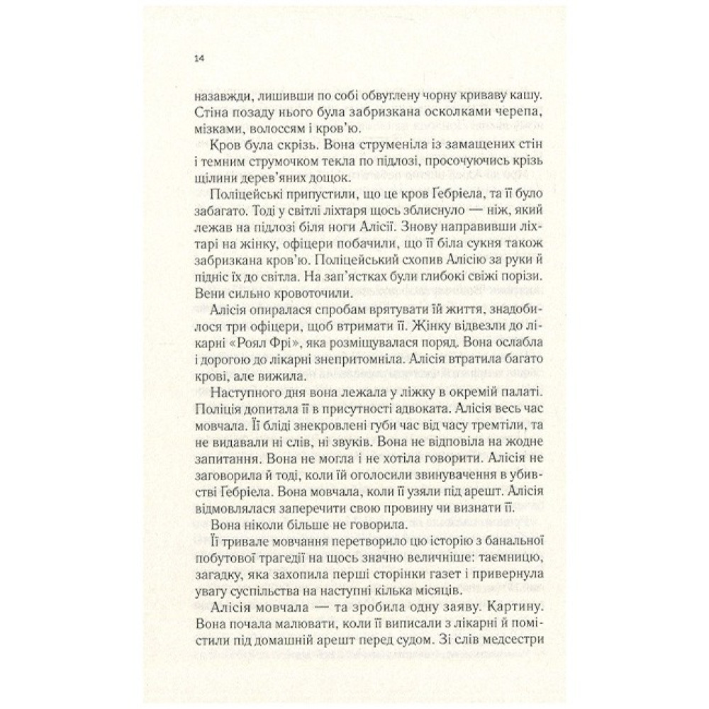 Життя Алісії Беренсон ідеальне. Успішна художниця та щаслива дружина, вона мешкає у великому будинку в найкращому районі Лондона. Аж поки одного вечора не всаджує п'ять куль в обличчя свого чоловіка. Жодного пояснення, жодного виправдання — протягом наступних шести років Алісія не вимовить ані слова. Тривале мовчання жінки і її таємничий автопортрет перетворили це вбивство на загадку для суспільства. Мовчазну пацієнтку переховують від уваги ЗМІ у «Ґроу», судово-медичній установі в Північному Лондоні. Психотерапевт Тео Фабер переконаний, що зможе розкрити таємницю злочину й вилікувати Алісію. Та причини її мовчання заховані куди глибше, ніж він гадав. І якщо вона заговорить — чи захоче лікар почути правду?