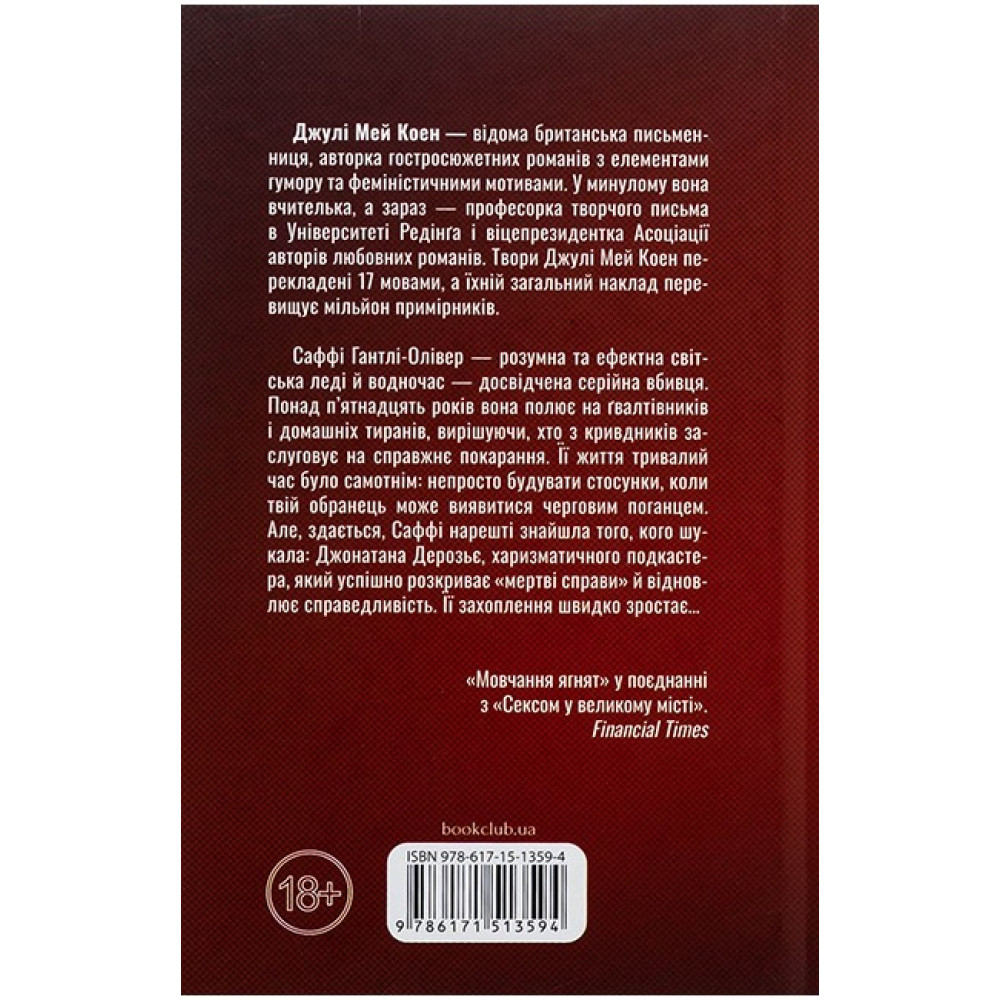 Саффі Гантлі-Олівер — розумна та ефектна світська леді й водночас — досвідчена серійна вбивця. Понад п’ятнадцять років вона полює на ґвалтівників і домашніх тиранів, вирішуючи, хто з кривдників заслуговує на справжнє покарання.Її життя тривалий час було самотнім: непросто будувати стосунки, коли твій обранець може виявитися черговим поганцем. Але, здається, Саффі нарешті знайшла того, кого шукала: Джонатана Дерозьє, харизматичного подкастера, який успішно розкриває «мертві справи» й відновлює справедливість. Її захоплення швидко зростає…