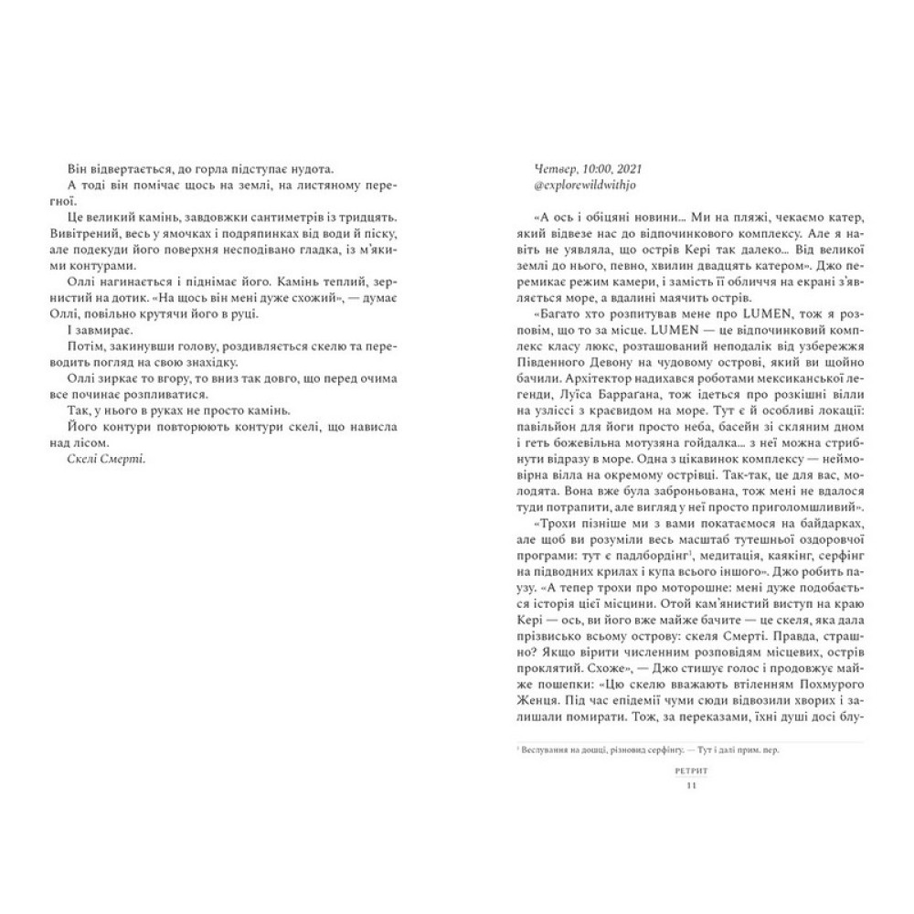 Увага! Продукція сексуального характеру або інша продукція з віковим обмеженням. Продаж неповнолітнім заборонено. Продаж відповідно до вікового обмеження.Довгоочікуване продовження «Санаторію»! На острові біля девонського узбережжя відкрився сучасний відпочинковий комплекс — справжня ідилія, місце, де можна забути про турботи й набратися сил. Втім, на цьому острові є й сумнозвісна скеля Смерті, де колись діяв маніяк-убивця. Подейкують, що ця місцина проклята. Під павільйоном для йоги знаходять тіло жінки — схоже, стався нещасний випадок, і вона розбилася. Але незабаром детективка Елін Ворнер з’ясовує, що ця жінка взагалі не мала тут бути. Що довше Елін перебуває на острові, то більше таємниць зринає навколо. І коли під водою знаходять ще одну жертву, вона починає підозрювати, що всі чутки про цей острів — правда. Схоже, історія повторюється, і він знову збере свою криваву данину… Чому варто придбати: ·Продовження історії детективки Елін Ворнер, з якою читачі познайомилися в «Санаторії» ·Моторошно-захоплива історія, яка не відпускатиме вас від першої сторінки аж до останньої ·Справжній подарунок для поціновувачів романів у стилі Агати Крісті