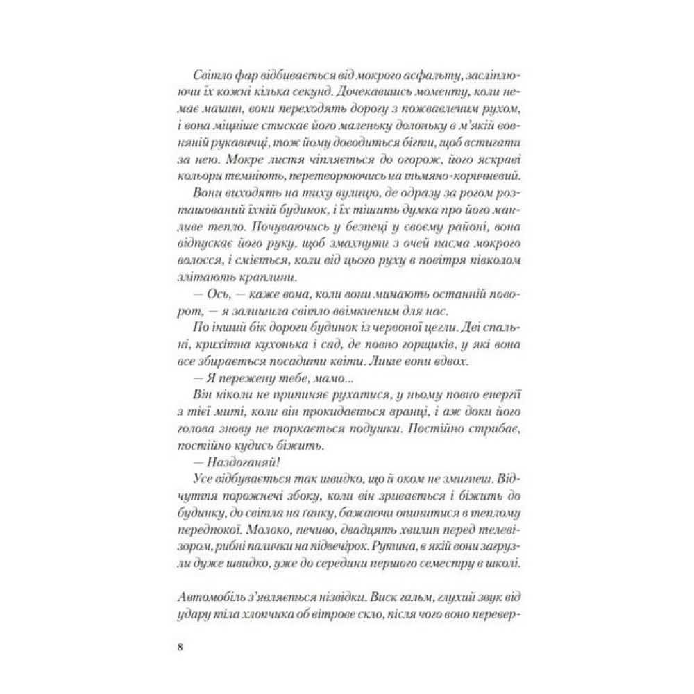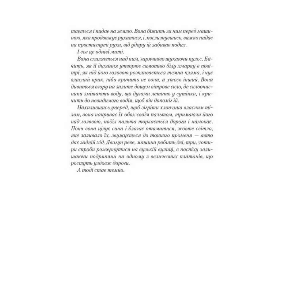 Трагічна аварія, у якій гине п’ятирічний Джейкоб, докорінно змінює життя багатьох людей, адже причетні до неї їдуть геть, навіть не зупинившись. Так, з місця події можна втекти, але як утекти від минулого? Це питання не дає спокою ні матері загиблого хлопчика, ні винним в аварії, ні поліцейським, що, розпочавши розслідування, кружляють хибними шляхами. Тільки зупинившись і поглянувши минулому в очі, герої роману отримують те, чого прагнуть: покарання для винних і звільнення від тягаря провини для решти.