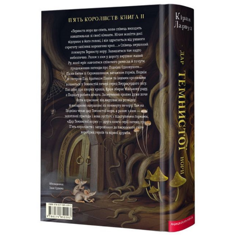 «Терниста нора ще спить, коли співець виходить навшпиньках зі своєї кімнати. Нічне жахіття досі відлунює в його голові, і він здригається від уявного скреготу залізних воронячих крил…» Співець змушений покинути Тернисту нору. Залишатися там надто небезпечно. Разом з ним у дорогу вирушає малий Ру, який мріє навчитися співочого ремесла й почути продовження легенди про Подкіна Одновухого... Після битви зі Скрамашенком, ватажком ґормів, Подкін із сестрою Паз, братиком Паком та іншими кроликами ховаються у Темнистій печері серед Хмуросердого лісу. Паз дбає про хворих кролів, Кром збирає військову раду, а Подкіну робити нічого. Засмучений кролик дуже хоче бути корисним: він вирушає на розвідку й випадково натрапляє на покинуту печеру. Там на Подкіна чекає дар Темнистої нори, а разом з ним — нові захопливі пригоди і нова зустріч з підступними ґормами. «Дар Темнистої нори» — друга книга серії легенд про П’ять королівств і запрошення до таємничого світу хоробрих героїв та вірної дружби.