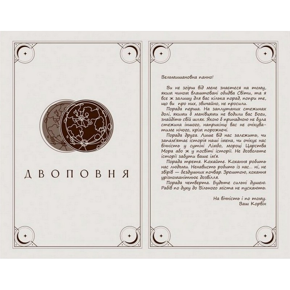 ДВА СВІТИ НА КРАЮ ПРІРВИУСЕ ЗАЛЕЖИТЬ ВІД ЇЇ ВИБОРУВідомо відвіку: одмінники залишаються чужинцями в обох світах, якщо не знайдуть сенсу життя.Ріна нарешті віднайшла свій дім у Прихованому світі й відчула, що вона потрібна тут. Але чи відшукала вона мету, заради якої варто боротися? Ниті тягнуться, відкриваючи усе більше таємниць. І ці таємниці змушують душу Ріни розриватися від кохання та болю.Час на роздуми спливає, і їй потрібно вирішити, на чиєму вона боці. Та що, коли вибір вже зроблено за неї? Мойри простягають їй чорну нить.Усе, що здавалося справжнім і правильним, руйнується. Стіна між світами береться тріщинами, і темрява виривається назовні. Скоро світ розпадеться на шматки - війна, що назрівала століттями, поглине всіх. І на небі залишиться тільки один місяць...