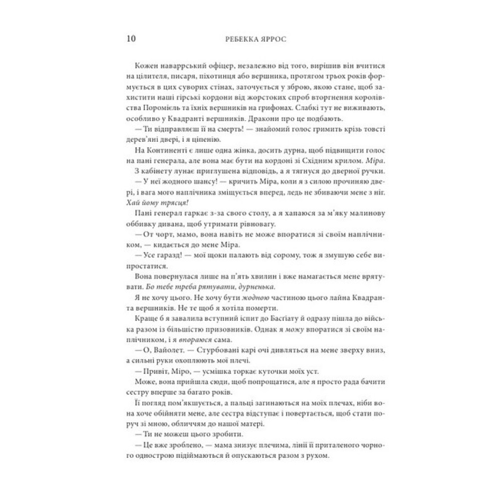 Увага! Продукція сексуального характеру або інша продукція з віковим обмеженням. Продаж неповнолітнім заборонено. Продаж відповідно до вікового обмеження.Пориньте в жорстокий світ військового коледжу для вершників драконів! Тут народжується еліта! Або помирає... Двадцятирічна Вайолет планувала провести життя серед книжок. Однак наказ матері, уславленої захисниці королівства, змінює все. Дівчина змушена приєднатися до сотень кандидатів, які прагнуть стати гордістю Наварри - вершниками на драконах. У військовому коледжі не терплять слабаків - ні люди, ні дракони. А Вайолет не може похвалитися силою, тож вона помре. Її вб’ють або курсанти, що прагнуть позбутися конкурентки, або полум’я дракона. Якщо, звісно, першим до її горла не дістанеться той, хто має персональний рахунок до її матері, а платити доведеться Вайолет. І, щоб побачити наступний схід сонця, дівчині знадобляться весь її розум і вся удача.