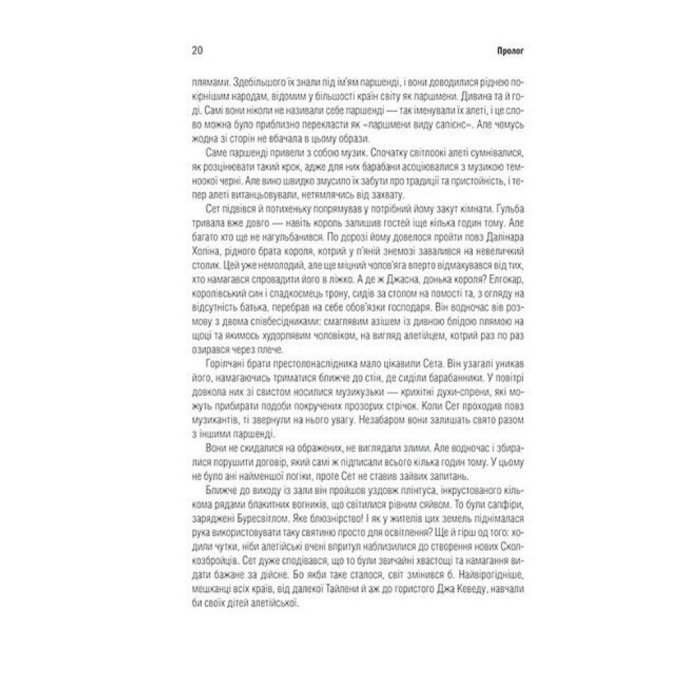 Перша книга циклу «Хроніки Буресвітла»Перевидання у збільшеному форматі з ілюстраціями та лясеБестселер «The New York Times»Фантастична сага рівня Толкіна та Сальваторе Забута магія повертається… Магія покинула людство зі зникненням Променистих лицарів. Єдине, що залишилося, - це Сколкозброя і Сколкозбруя. Той, кому пощастило заволодіти цими артефактами, стає могутнім воїном. Утім невдовзі Рошар - світ бур і скель - зміниться навіки. Бо землею ходять троє. Убивця, який повеліває силами гравітації. Стомлений війною полководець, що передрікає апокаліпсис. Та син хірурга - колишній солдат, що став рабом, - до якого прив’язався дух-спрен. Але найбільшу таємницю приховує четверта з них - дівчина-спудейка, яка прибула на навчання до вченої-єретички. Ці четверо можуть врятувати Рошар. Або знищити назавжди…Про автораБрендон Сандерсон — культовий американський письменник-фантаст, володар однієї з найпрестижніших літературних нагород Hugo Award, а також багаторазовий переможець David Gemmell Memorial Award, The Goodreads Choice Awards та Neffy.
