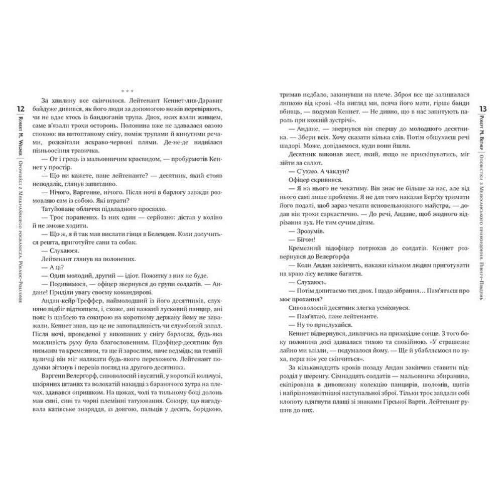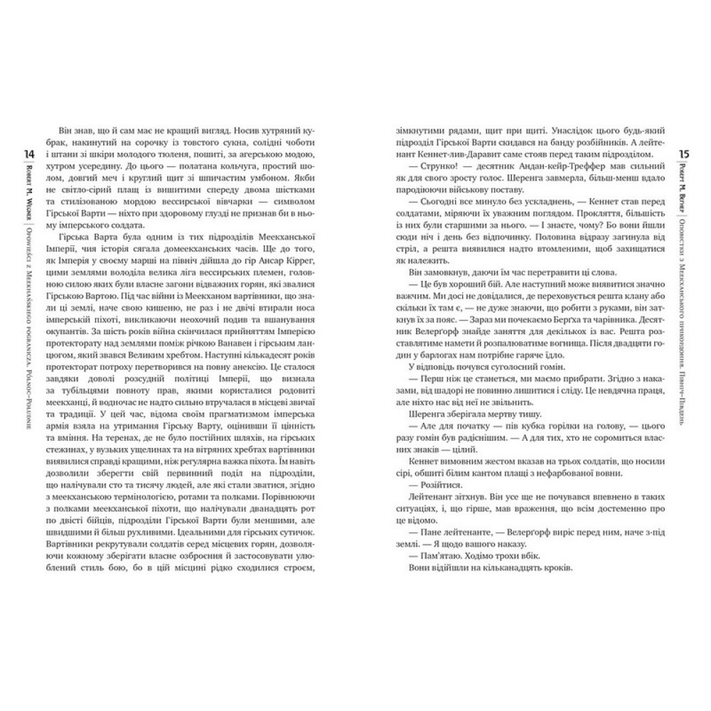 Роберт М. Веґнер — автор найгучніших польських фентезійних романів останнього десятиліття. Цикл про Меекханську імперію — захоплива, оригінальна і драматична історія про честь і обов’язок, кохання й ненависть. Критики порівнюють книжки Веґнера з романами Ґлена Кука, Стівена Еріксона та Джо Аберкромбі. «Оповістки з Меекханського прикордоння» — це справді нове слово в жанрі, яке поєднує найкращі риси класичного фентезі й сучасних історичних романів. Це історії про живих людей, що мусять зіткнутися з тим, що перевершує їхні сили, і не мають жодного права відступити. Далека зимна Північ, межа Меекханської імперії. Імперських чиновників тут рідко зустрінеш, лише Гірська Варта дбає про громадян. Шоста рота оберігає місцевих мешканців від грабіжників та ворожих племен, від дикої магії та від тих, хто спокусився забороненими ритуалами. Однак навіть Гірська Варта інколи стикається з неймовірним — і тоді їм лишається сподіватись тільки на власну зброю та на честь горянина. А на пустельному Півдні молодий воїн і неперевершений фехтувальник із таємничого племені іссарам наймається охоронцем до купця — і має обирати між коханням та власною честю. Його вибір уплине на долю людей та богів, а сам Йатех опиниться лицем до лиця із прадавньою історією та застарілою трагедією… Цикл відзначено низкою нагород, зокрема: чотирма преміями імені Януша Зайделя, двома преміями імені Єжи Жулавського і двома преміями SFinks, а також званням «Найкраща книжка» за результатами голосування на порталі Katedra.