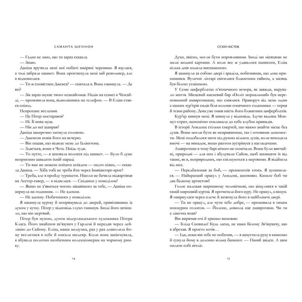 Вітаємо в Сайоні. Найбезпечнішому місці. 2059 рік. Республіка Сайон уже два століття веде в Європі жорстоку кампанію проти неприродності. Пейдж Магоні посідає високе становище у злочинному світі Лондона. Вона — права рука безжального Білого Зв’язувача — снохода, представниця рідкісного та грізного різновиду ясновидців. За сайонським законодавством вона скоює зраду, просто дихаючи. Після арешту за вбивство Пейдж знайомиться з таємничими засновниками Сайону, яких зацікавили її непересічні здібності. Щоб вижити й утекти, Пейдж має скористатися всіма своїми вміннями — і довіритися тому, хто мав би бути їй ворогом. Чому варто прочитати:Книжки авторки вже перекладені 28 мовами, здобувши визнання по всьому світові, і ось нарешті «Сезон кісток» виходить українською.Світ, вигаданий Шеннон, детально пропрацьований: сторінки рясніють специфічними поняттями та розбудованою для циклу термінологією. Матеріалу було достатньо багато, щоб додати глосарій та список персонажів наприкінці видання.Авторка занурює читачів в естетику вікторіанської Англії, звертається до грецької міфології та переосмислює деякі добре відомі міфи.